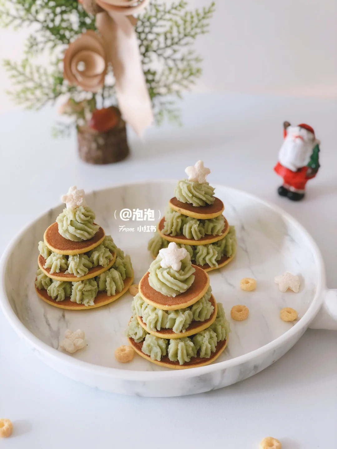 3️⃣造型部分:按照大、中、小的顺序,依次在松饼上挤上一圈山药泥,最后可以拿星星的小泡芙点缀一下就可以啦。