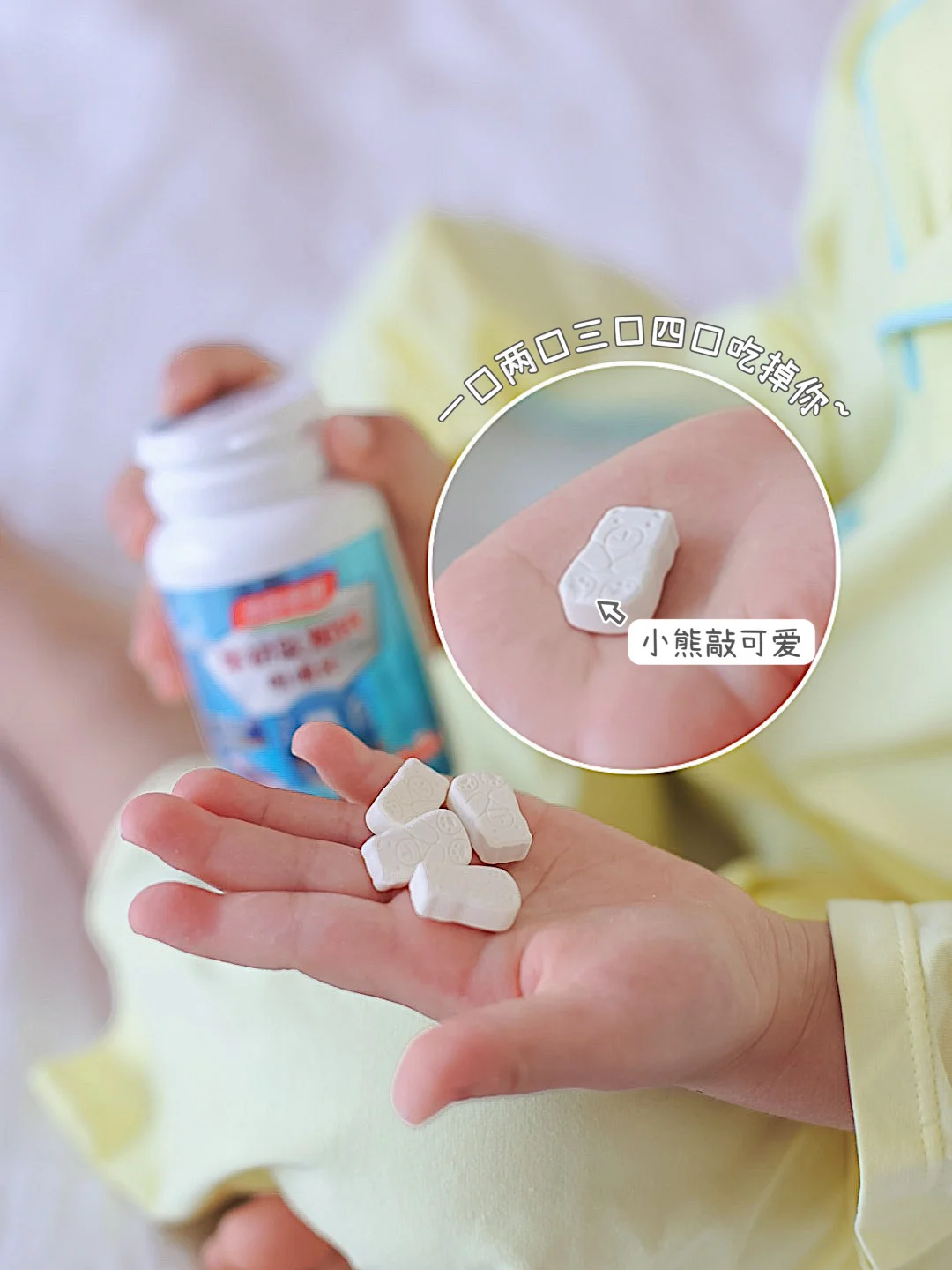 牛初乳钙片里面的钙含量很高,而且钙片是可爱的小熊造型🐻就像我们小时候吃的奶片一样,奶香味十足,好吃又营养~可以含着吃也可以嚼着吃,个人感觉嚼着吃奶香味会更足一些,我也尝试吃过,别说宝宝爱吃,我也挺爱吃,但是每天4片就可以啦,不要吃太多哦[偷笑R][偷笑R][偷笑R]