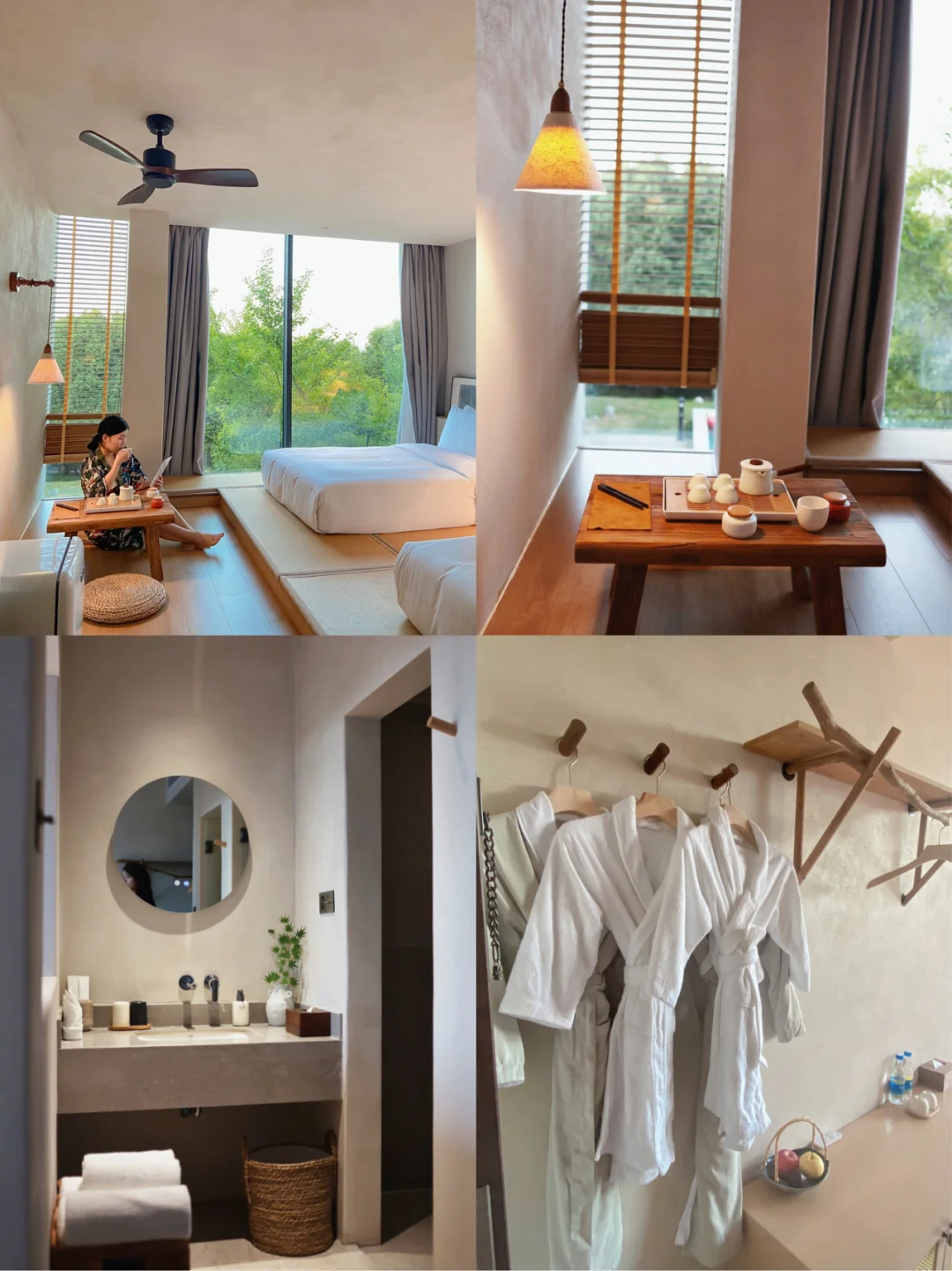 总共只有11间,每一间都很好看,窗外景色都好,我们住的是标间有两张床,地台式的床对小朋友很友好,榻榻米的日式风格,如果是四大两小就可以像我们一样把两个床拼在一起就好了,房间有茶具,还有漂亮的和服👘,穿上拍照氛围感立马拉满。