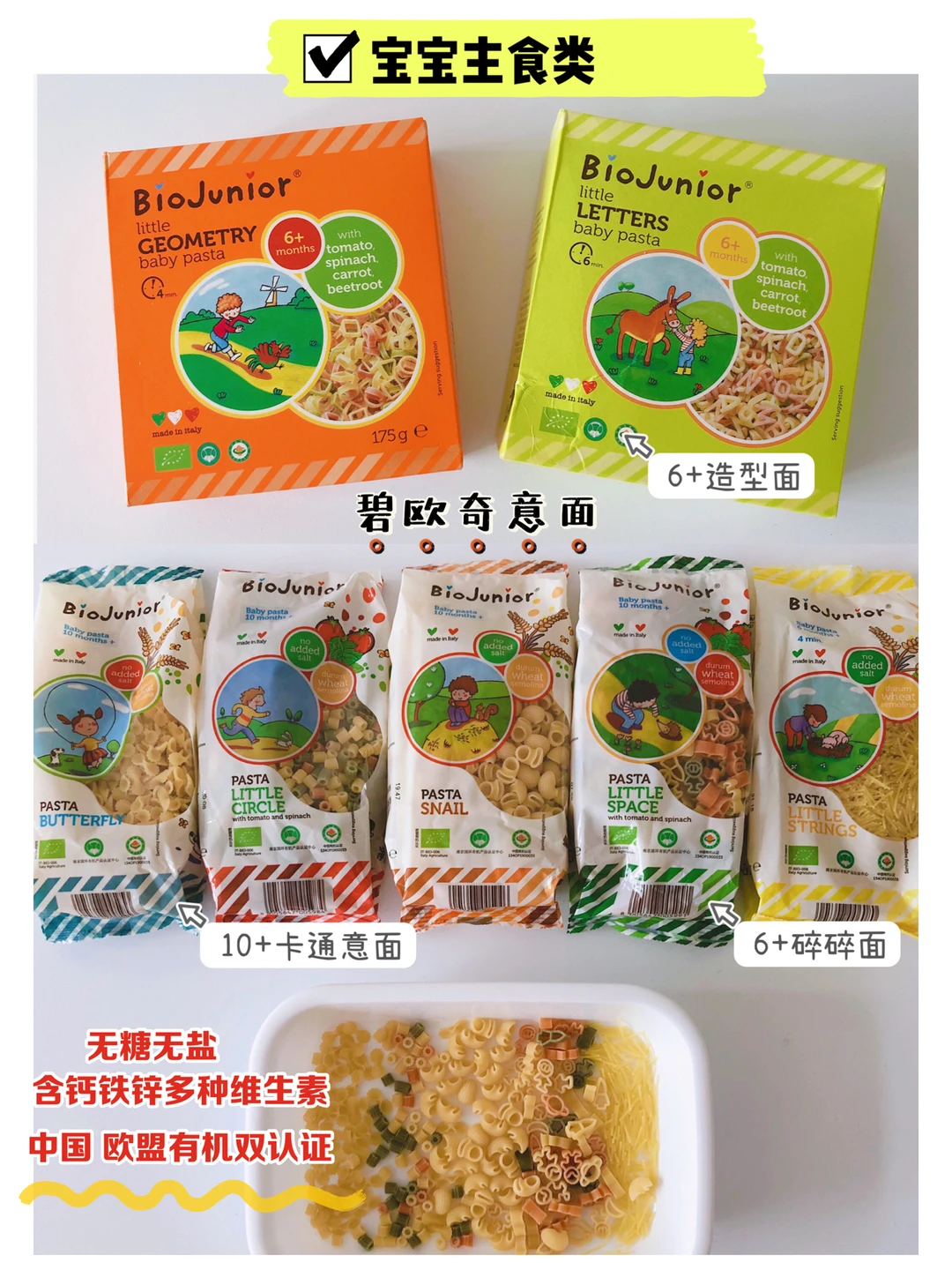 是中国和欧盟双重有机认证的专门为宝宝设计的一款面,不含盐,富含多种维生素A.D.B1.及钙铁锌,造型非常可爱,颜色也是非常多样,由5种食材染色,可以很放心给宝宝食用