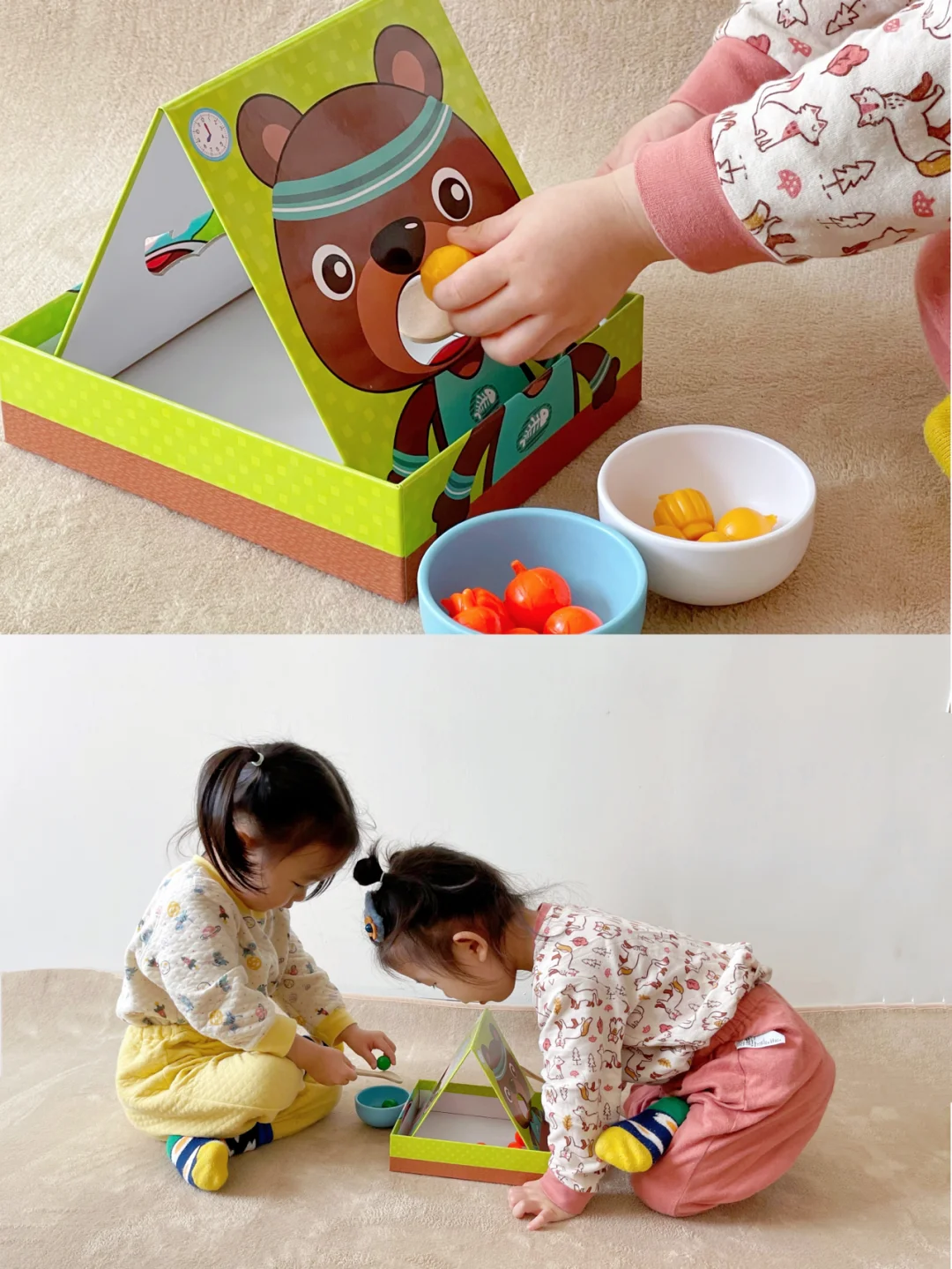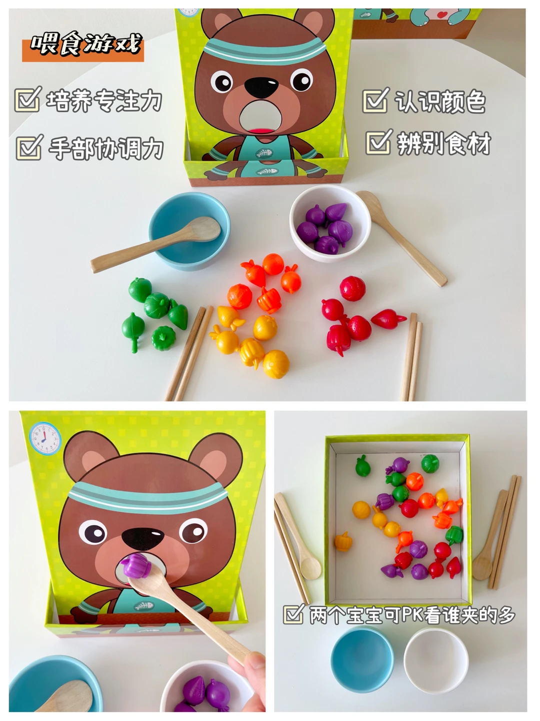🔹两面都有可爱的小动物(小熊 & 小河马)宝宝可以用勺子或者筷子练习给小动物喂食