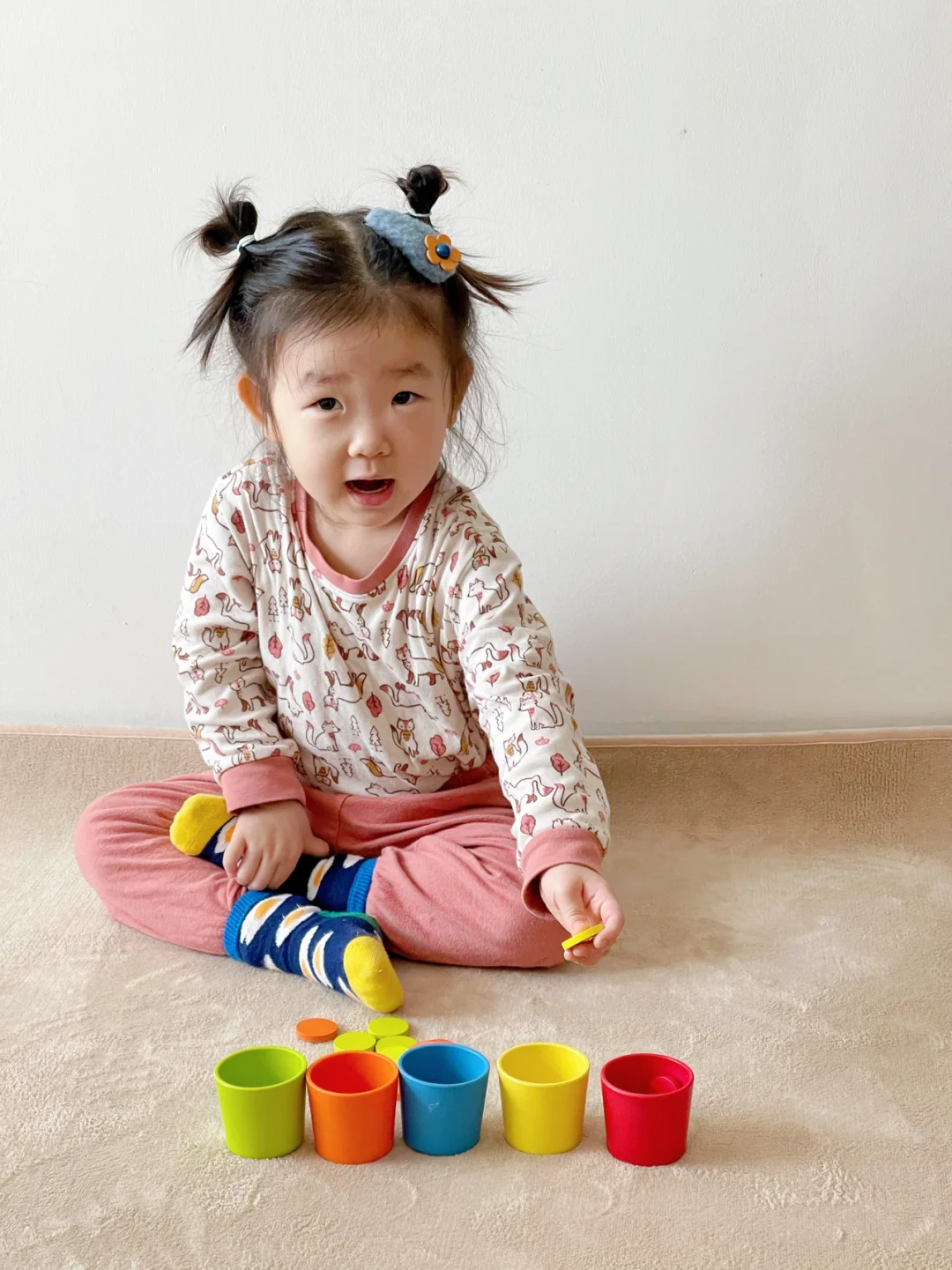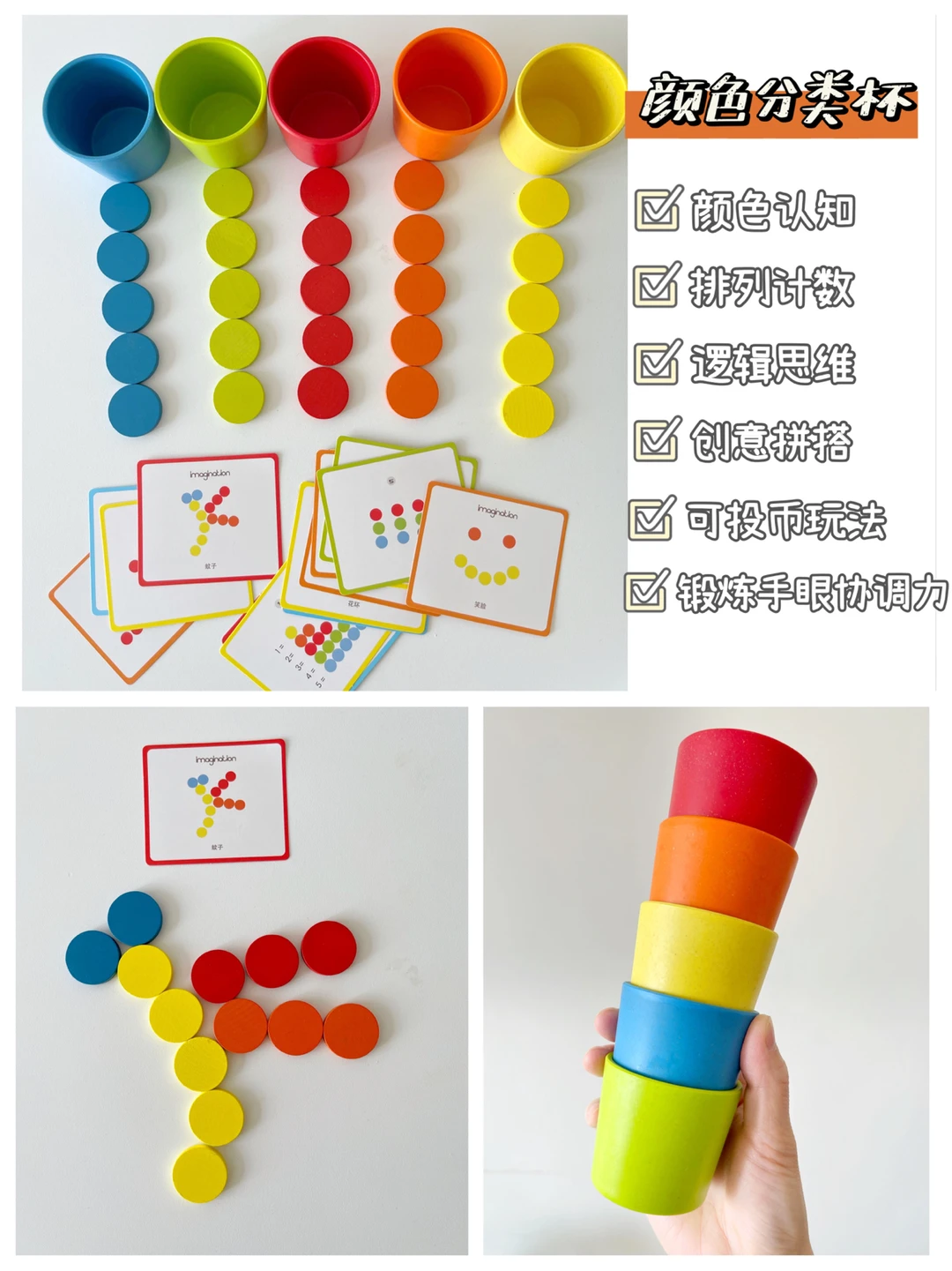 🔹多种玩法:颜色认知分类,感官锻炼(将相同颜色的圆片放进对应颜色的杯子里)