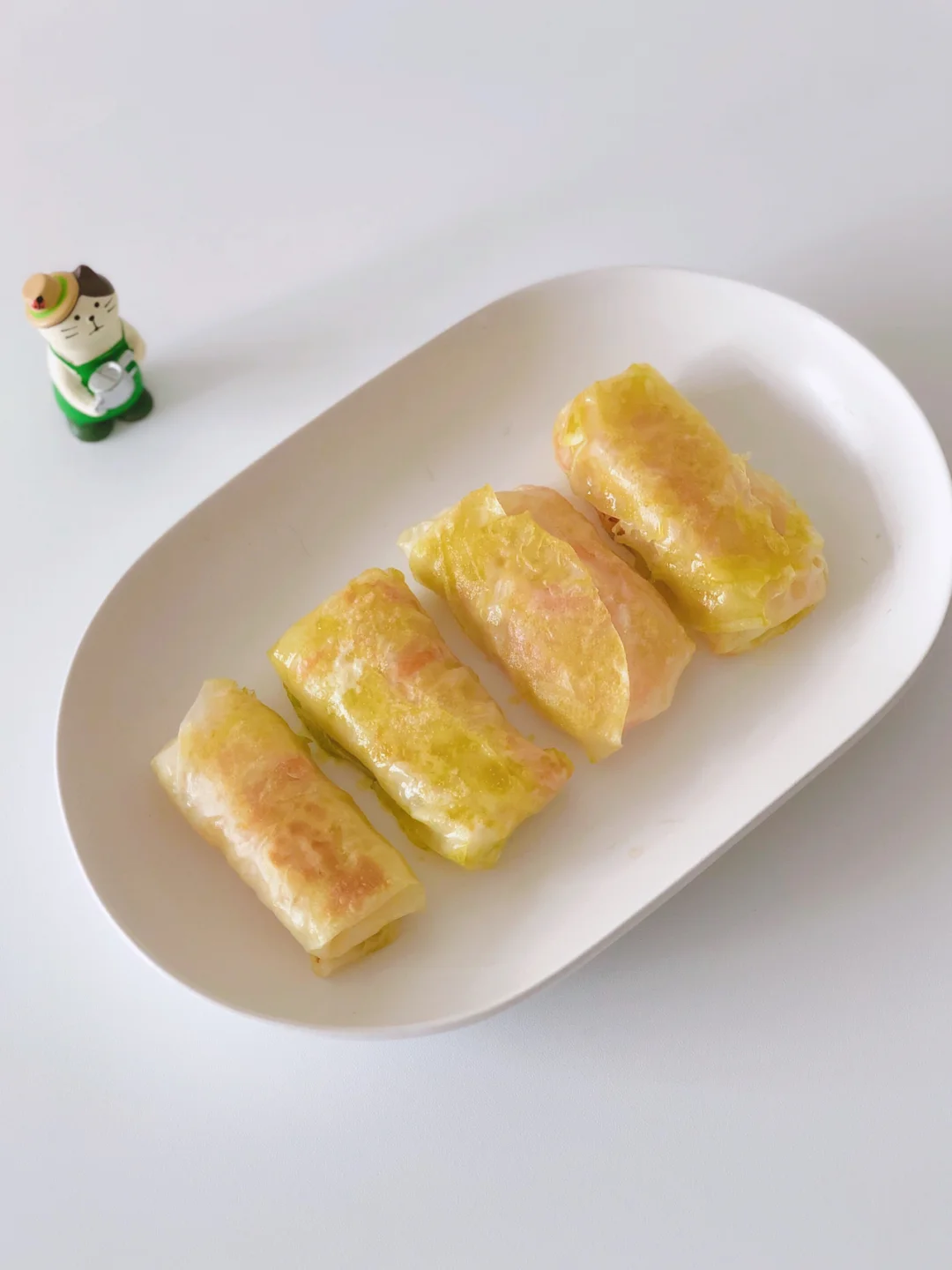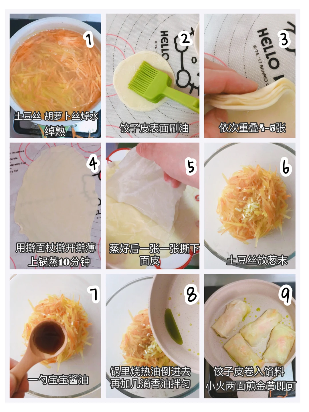 🔹蒸好饺子皮后,趁热依次撕下来,放入适量的土豆丝和胡萝卜丝,像叠春卷的方法一样,卷好。🔹锅中油热后,放入土豆丝卷,小火两面煎至金黄即可。