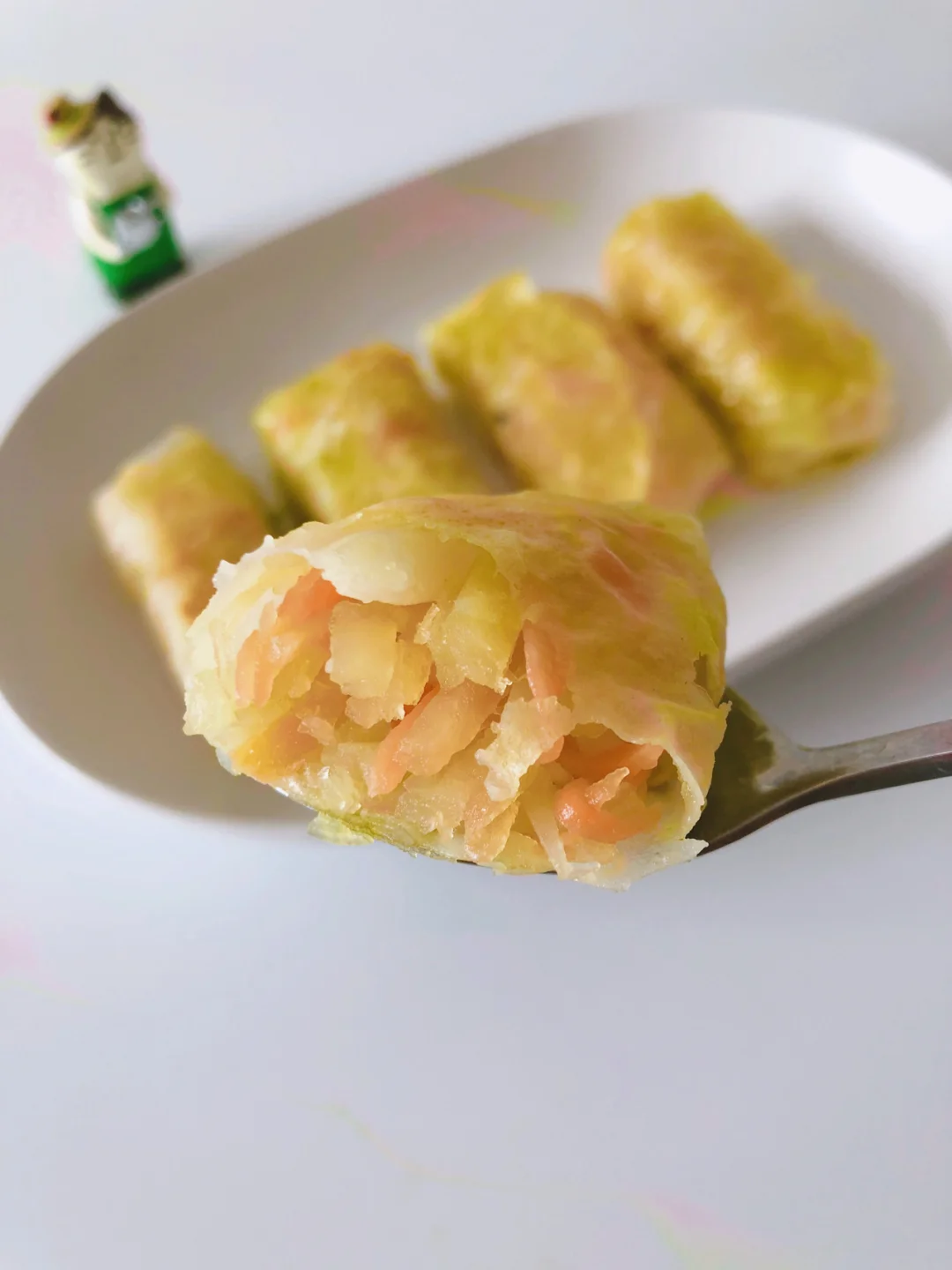 🔹整的时候可以准备馅料。控干水的土豆丝和胡萝卜丝里放入一点葱末,倒入一点烧热的宝宝油,滴几滴芝麻油拌匀即可。
