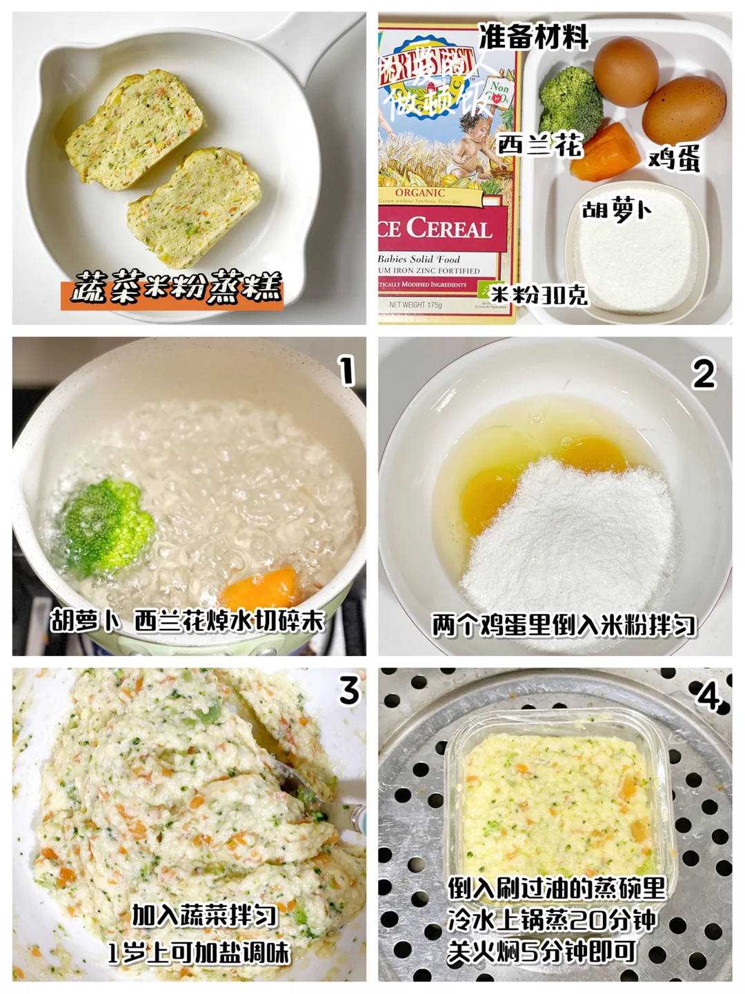 🔹胡萝卜和西兰花焯水切碎末,鸡蛋里倒入米粉拌匀,再放入蔬菜碎拌匀。蒸碗里刷油,倒入米粉糊,蒸法同上。(1岁+的宝宝可加盐调味)