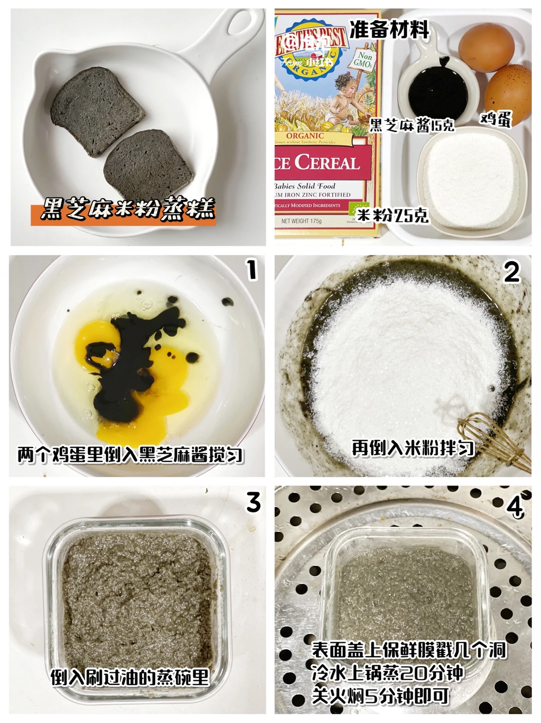 🔹鸡蛋里放入黑芝麻酱搅匀,再倒入米粉拌匀,蒸碗里刷油,倒入米粉糊,表面盖上保鲜膜,戳几个洞,冷水上锅蒸20分钟,关火焖5分钟即可。