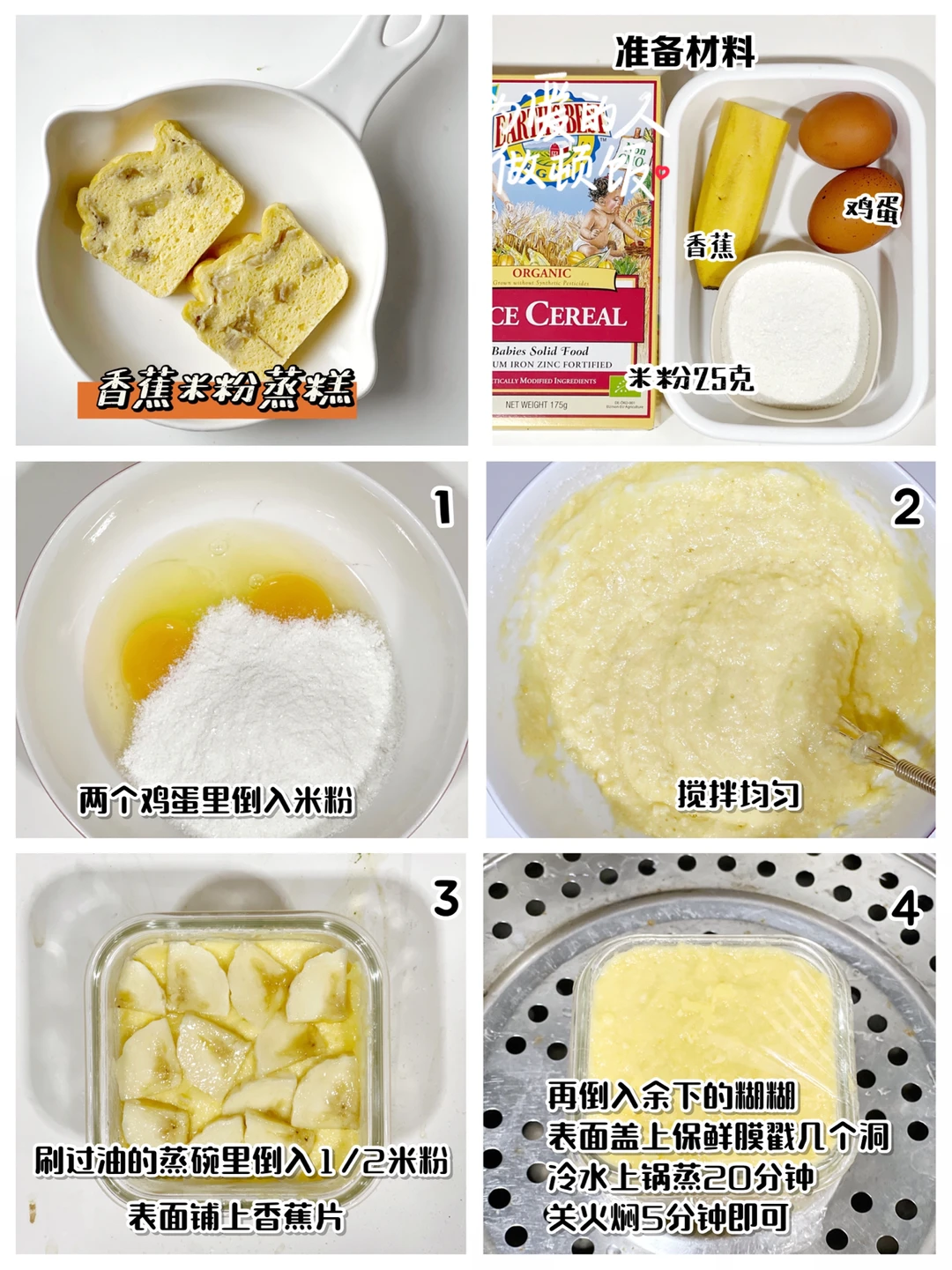 🔹鸡蛋里放入米粉搅拌均匀,香蕉切薄片,蒸碗里刷油,先倒入1/2米粉糊,上面码上香蕉片,再倒入余下的米粉糊,表面盖保鲜膜戳几个洞,冷水上锅蒸25分钟,关火焖5分钟即可。