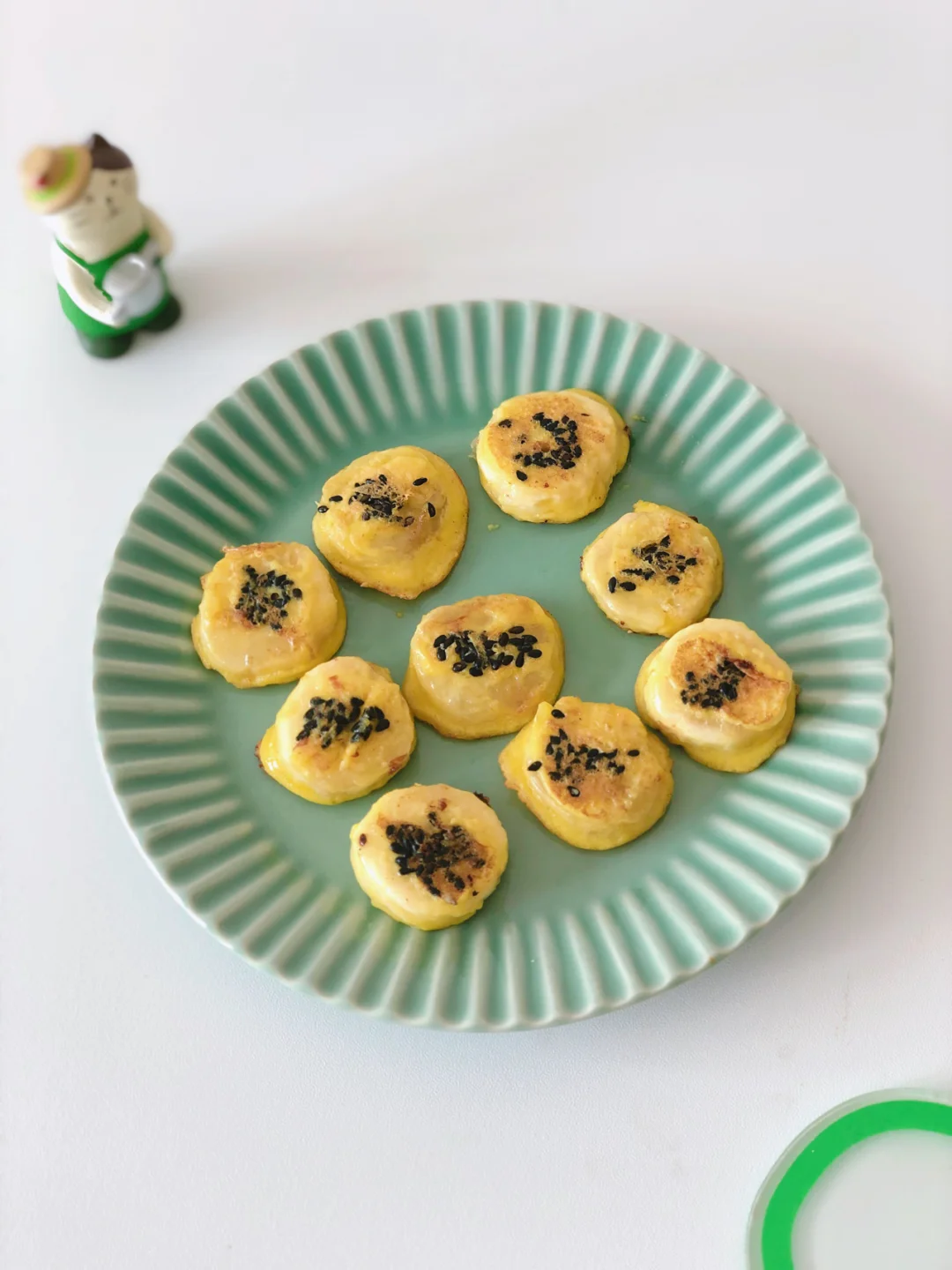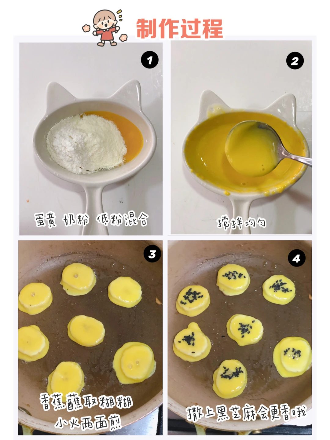 🌸安利一款自制宝宝小零食——香蕉小饼,做法真的超简单,8月+的宝宝都可以尝试哦,味道真的可。 🎀准备材料:香蕉一根,蛋黄一个,一勺低筋面粉,一勺奶粉。 ⬇️制作方法:⬇️ 1️⃣把蛋黄、低粉、奶粉放一起搅拌均匀. 2️⃣香蕉切片,裹上蛋黄糊,小火两面煎至煎黄即可. 3️⃣最后撒上点芝麻味道会更香哦。 💡Tips: 蛋黄糊太厚的话可以加一丢丢水。