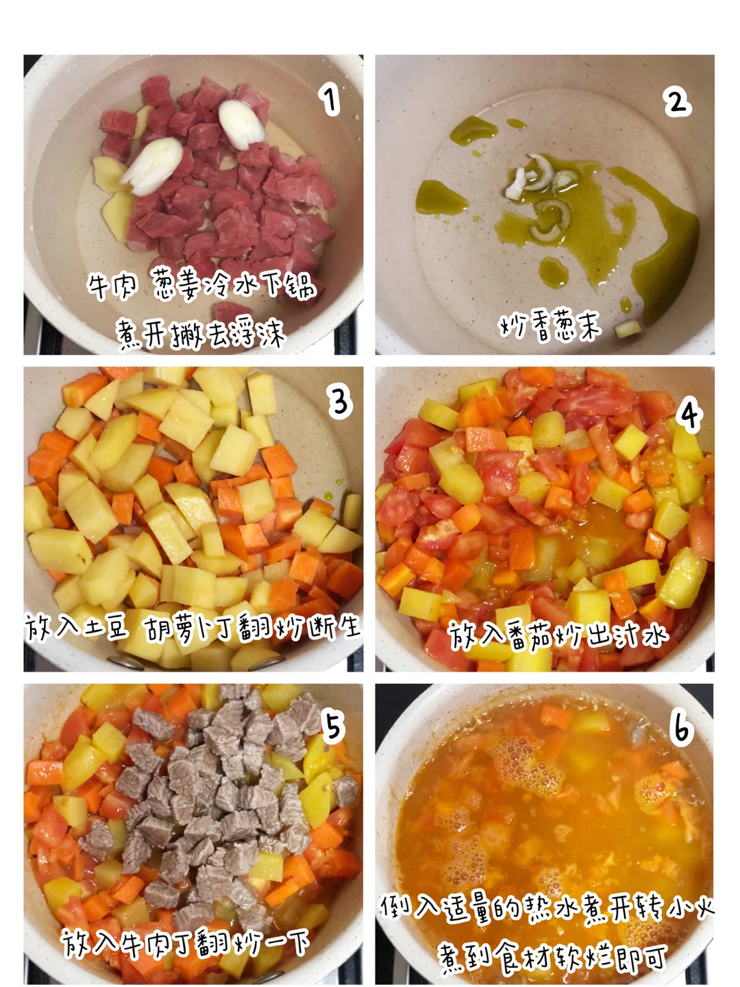 3️⃣另起一锅,放入葱末炒香,放入土豆丁和胡萝卜丁翻炒一下断生,放入番茄炒出汁水,放入牛肉丁翻炒一下,再倒入末过食材再略微多一些的热水炖煮,煮开转小火,待食材煮到软烂即可。