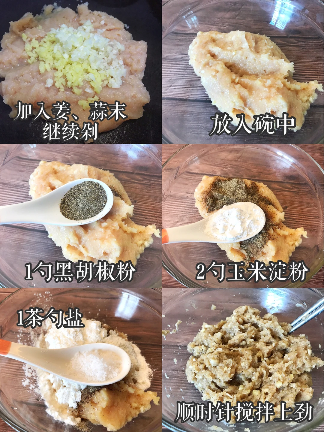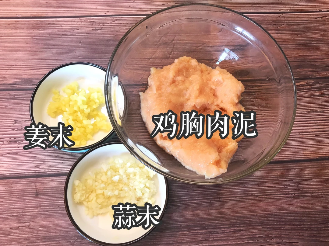 👩🍳做法:1.鸡胸肉去筋膜,切小块剁成泥,再加入蒜末、姜末继续剁成蓉,放入碗中加入黑胡椒粉、玉米淀粉、食盐搅拌均匀。