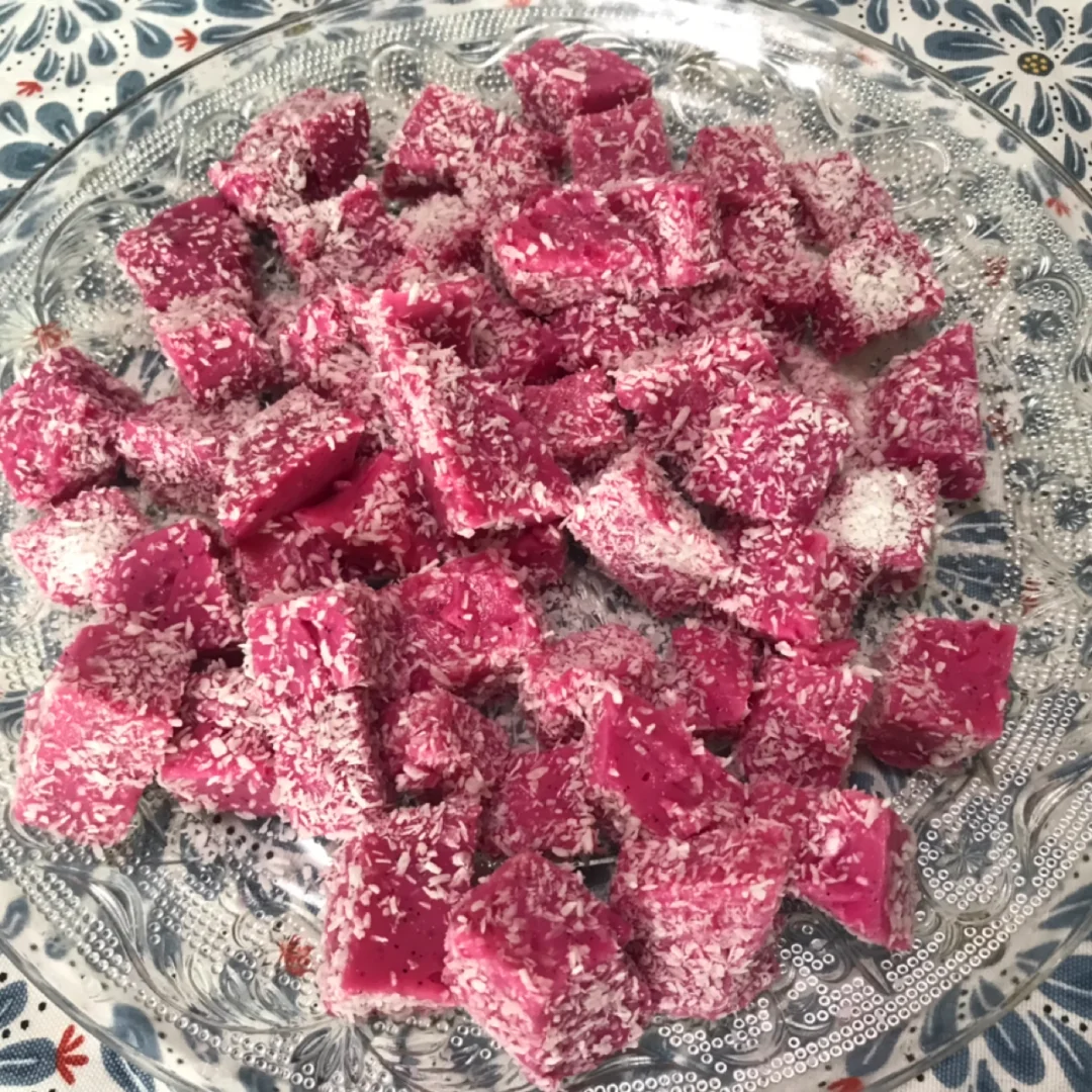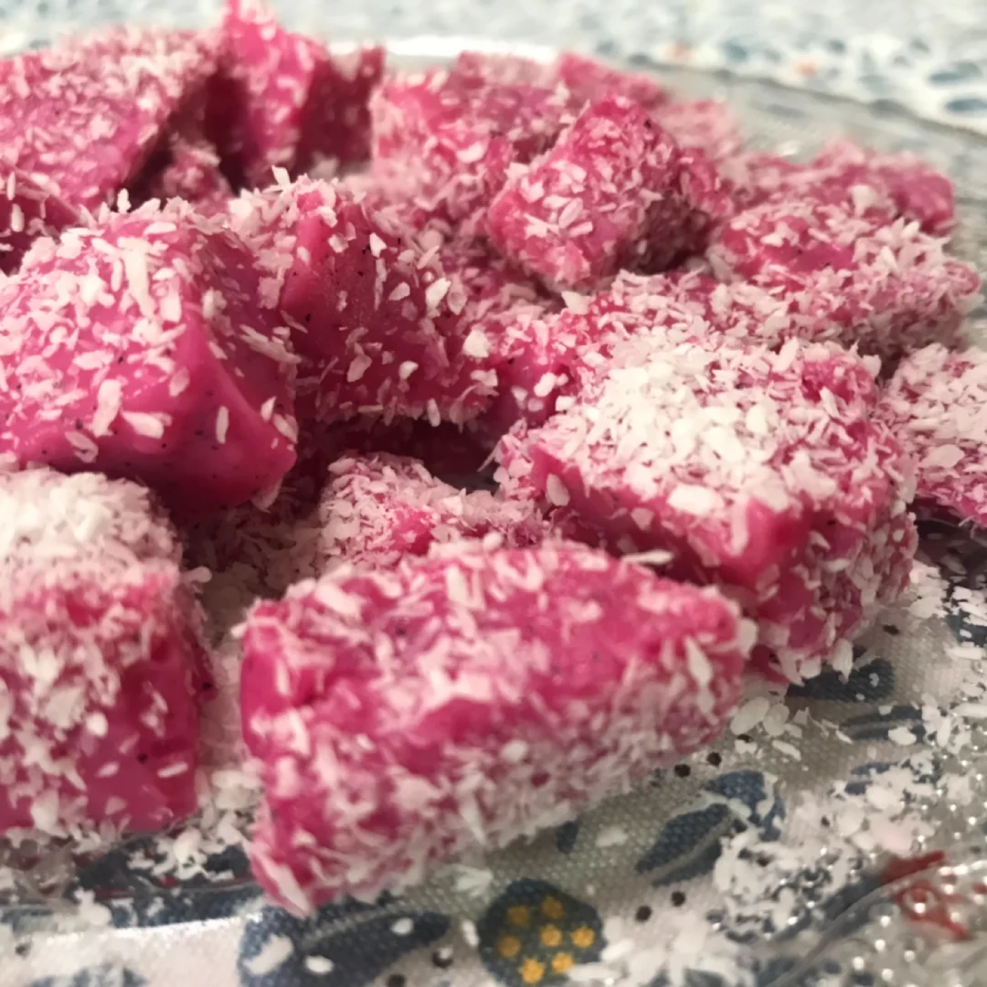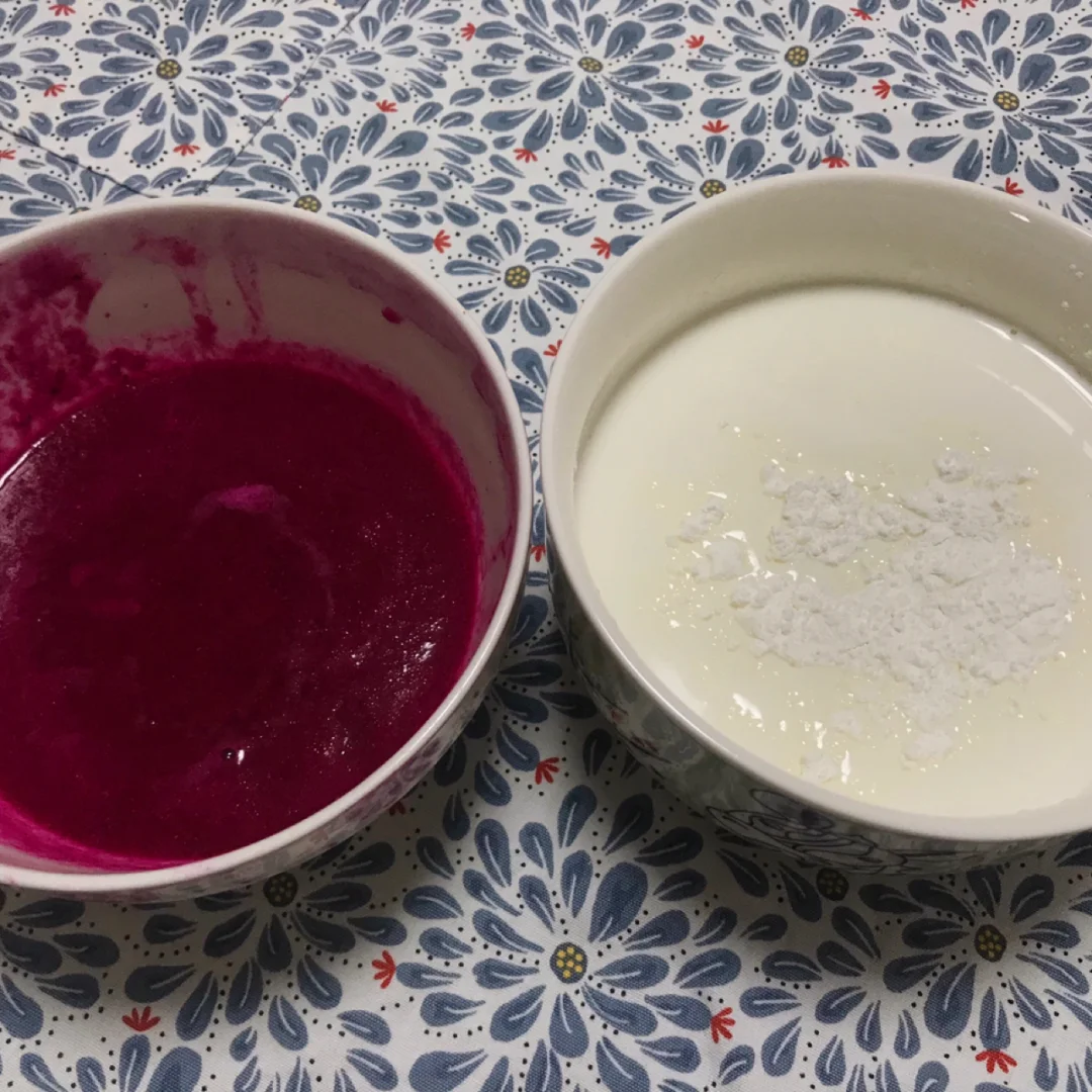 准备食材:牛奶320毫升、玉米淀粉45克、白糖20克 红心火龙果半个、椰蓉适量 步骤:1、先把火龙果切一半,再切块榨成果汁 2、用面粉筛过滤果汁去籽,口感会更细腻 3、牛奶中加入准备好的玉米淀粉、白糖搅拌均匀 4、放入平底锅中继续搅拌(一定要小火)!!!搅拌不要停,成糊状即可 5、乘碗放凉,再放进冰箱冷藏2-3小时定型 6、冷藏后切块,再粘上椰蓉装盘 👩小仙女必备的夏日小甜品哦,少女心爆棚😋既不上火又美容的小方 嘻嘻 快动手吧🌟