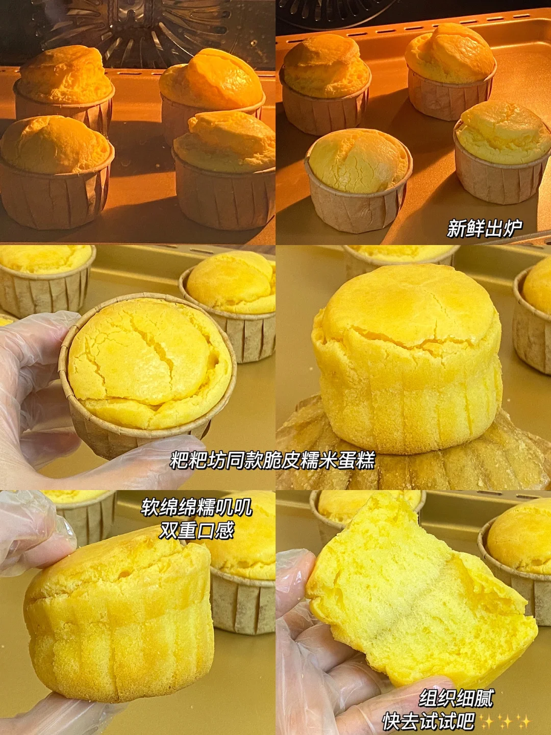 🌷食材:全蛋3个,细砂糖40g,纯牛奶35g,玉米油40g,糯米粉100g,泡打粉4g。 🌷做法:1.鸡蛋、细砂糖打发至划8字不轻易消失(大概打发8分钟) 2.筛入糯米粉、泡打粉,翻拌至无干粉。 3.玉米油、牛奶搅拌至乳化,分3次倒入面糊中(每一次都要翻拌均匀再加入) 4.烤箱150度预热10分钟,将面糊倒入纸杯中,轻震一下,150度烤制30-35分钟,最后几分钟观察上色情况。 🌷粑粑坊同款脆皮糯米蛋糕,软绵绵糯叽叽,双重口感,组织细腻,快去试试吧[赞R][赞R][赞R]