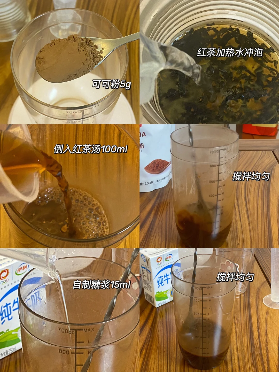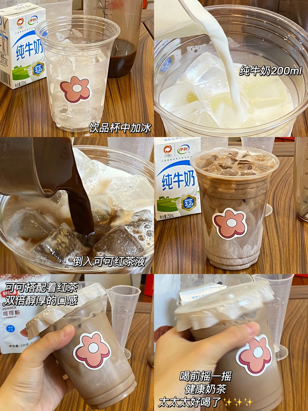 🌷食材:红茶,可可粉,纯牛奶,自制糖浆,冰块。 🌷做法:1.可可粉5g放入雪克杯中。 2.用热水冲泡红茶。 3.倒入红茶汤100ml,自制糖浆15ml,搅拌均匀。 4.饮品杯中加冰,倒入纯牛奶200ml,倒入可可红茶液。 🌷可可搭配着红茶,双倍醇厚的口感! 🌷喝前记得摇一摇,健康奶茶,太太太太好喝啦!