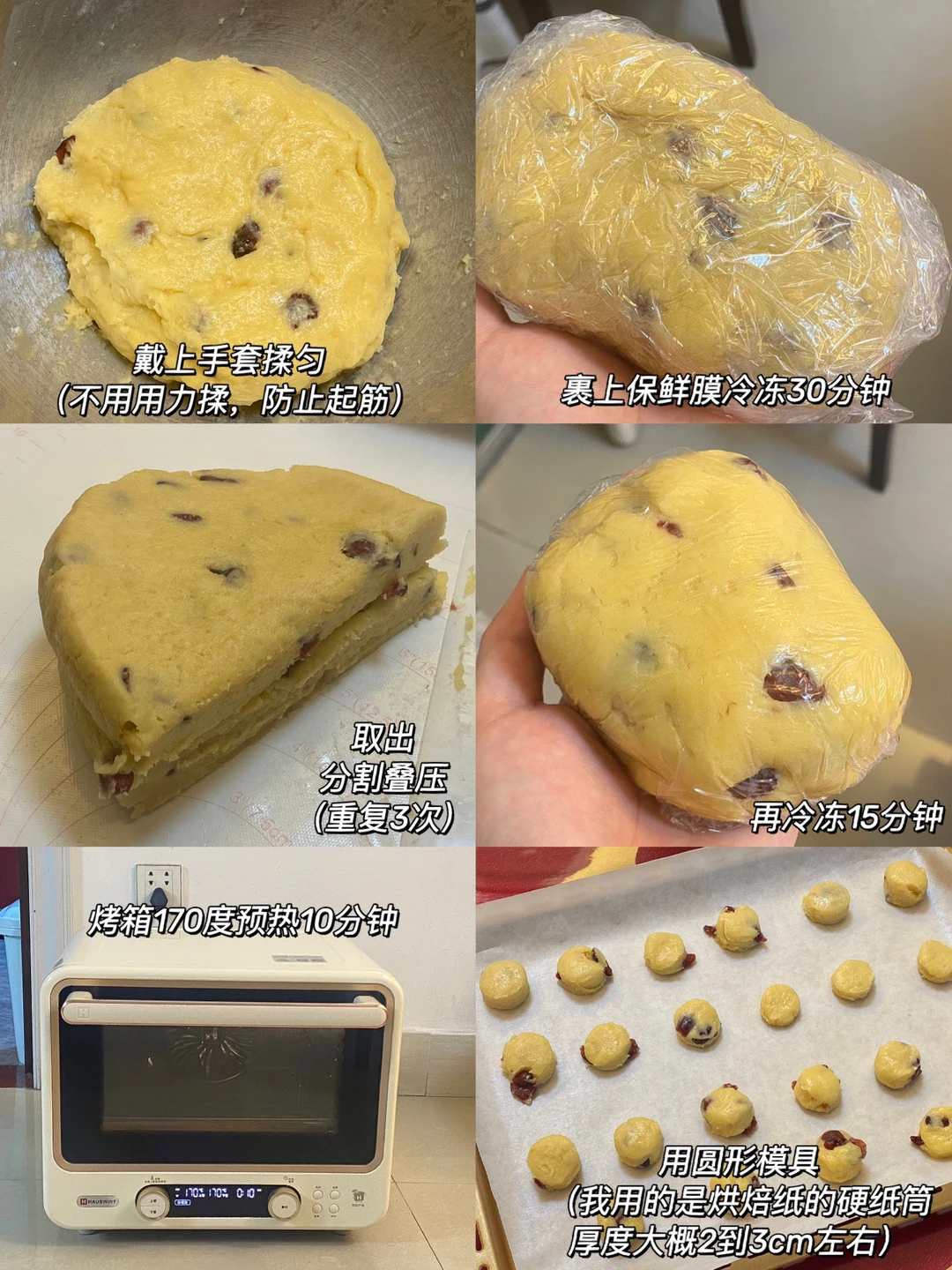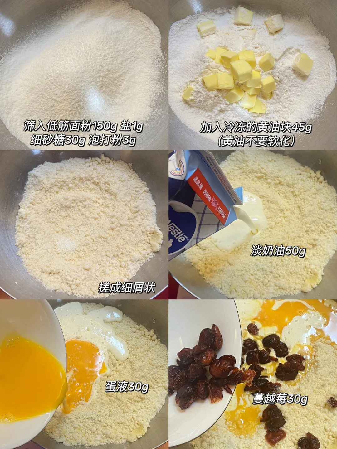 🌼食材:低筋面粉150g,盐1g,细砂糖30g,泡打粉3g,黄油45g,蔓越莓30g(没有也可以不加)鸡蛋1个,淡奶油50g。