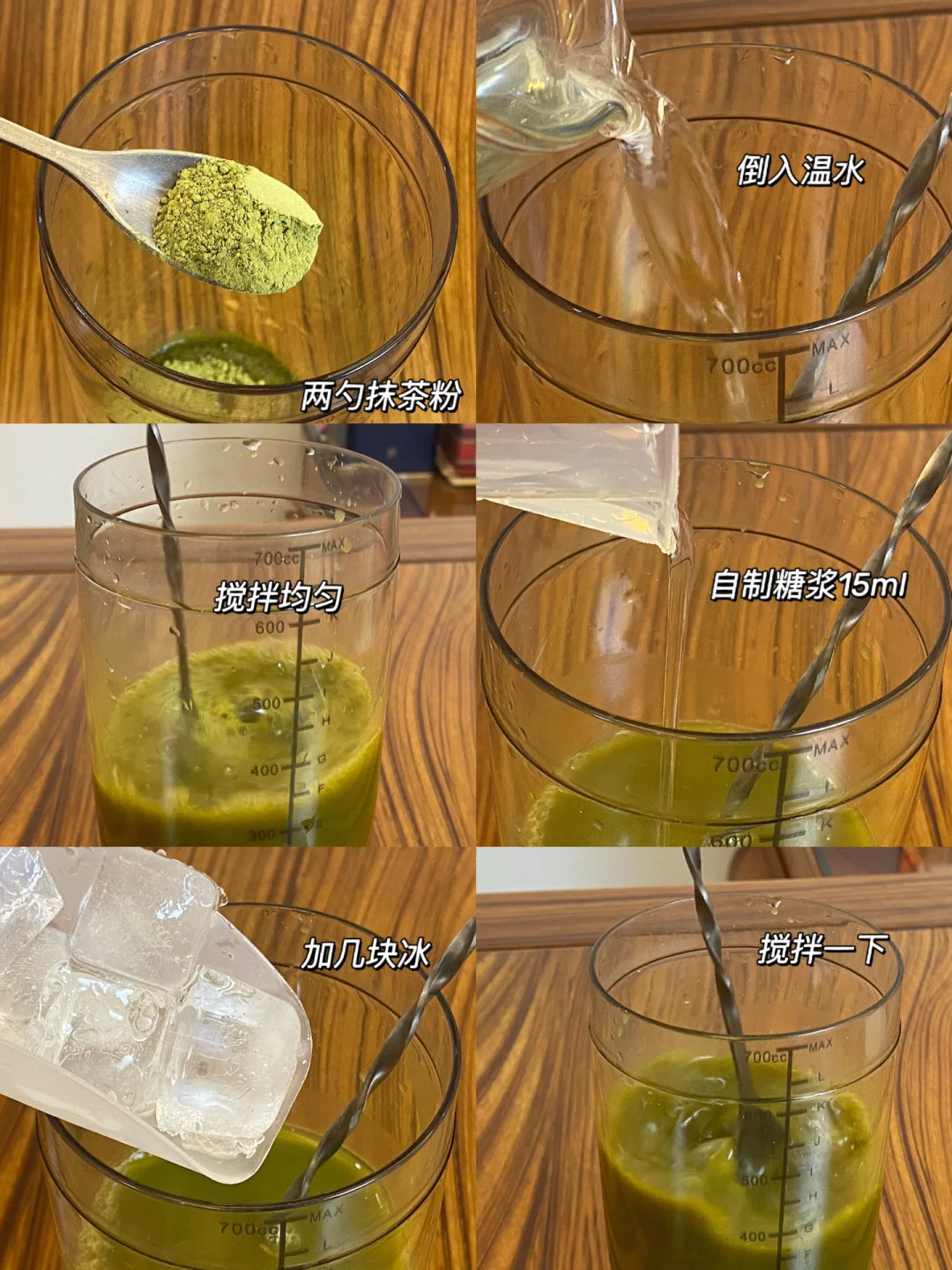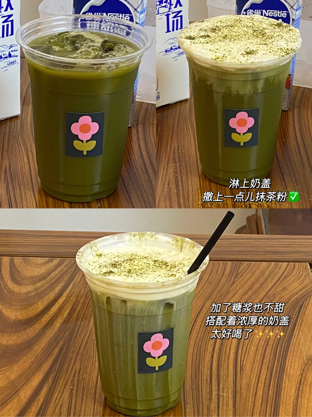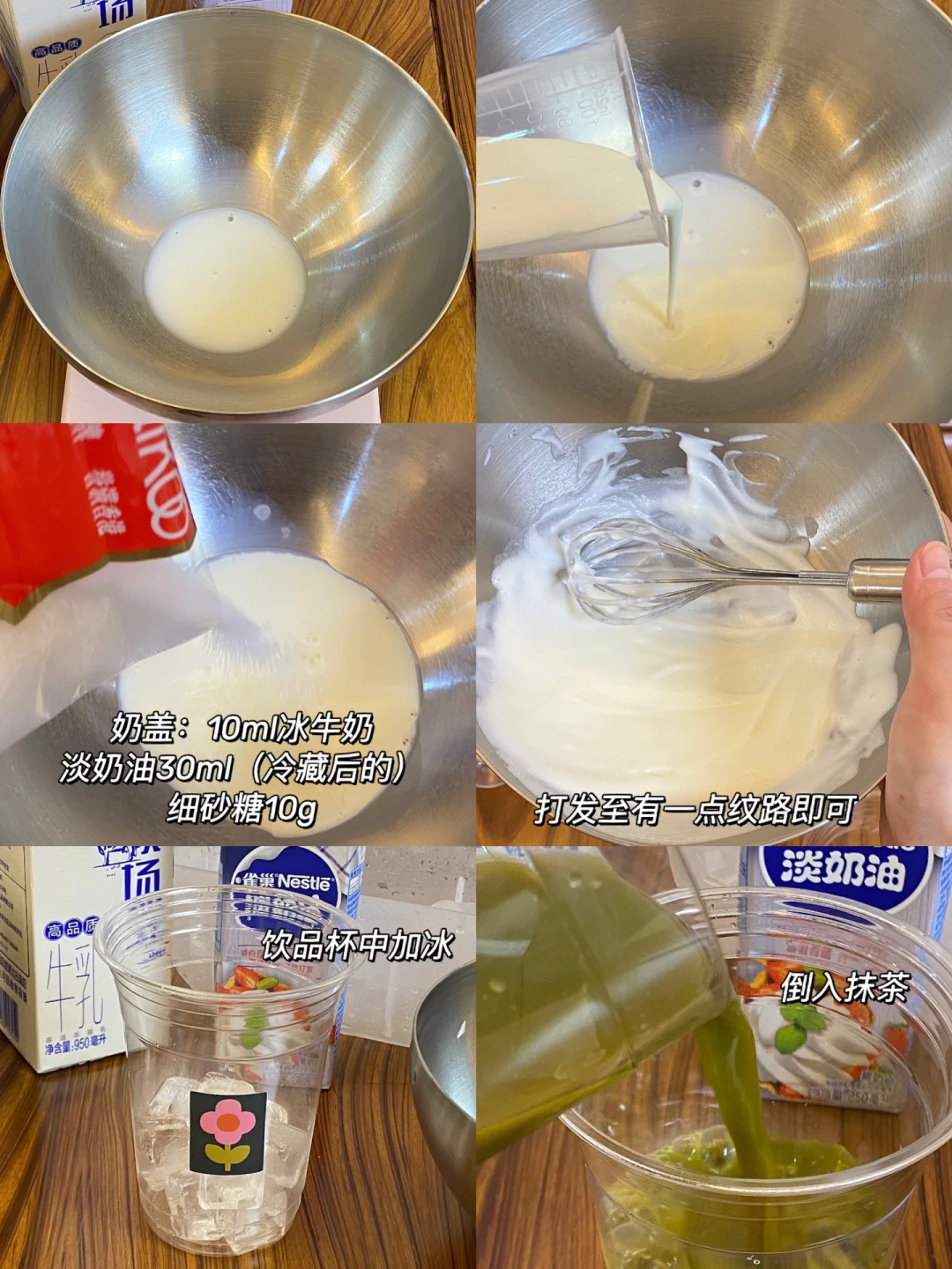 🌼奶盖:冰牛奶10ml,淡奶油30ml(冷藏后的)细砂糖10g,搅打至有一点纹路即可(不要打发过头哦) 🌼抹茶茶汤做法:1.两勺抹茶粉,加入温水至刻度线350ml,搅拌均匀,加入自制糖浆15ml,加几块冰搅拌一下。 2.饮品杯中加冰,倒入抹茶茶汤,淋上打发好的奶盖,撒一点儿抹茶粉✅ 🌼有一點點那味儿啦!加了糖浆也不甜,搭配着浓厚的奶盖,太好喝啦[派对R][派对R][派对R]
