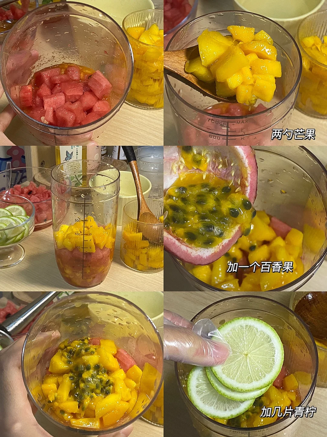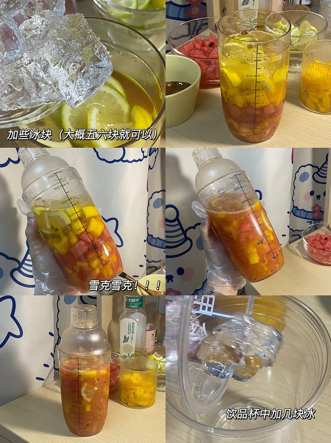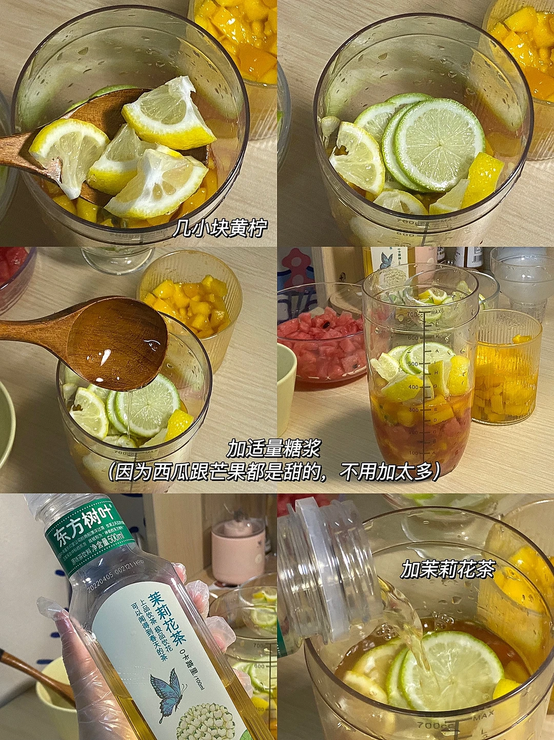 🧚♀️食材:西瓜,芒果,黄柠檬,青柠,百香果,冰块,自制糖浆,茉莉花茶。
