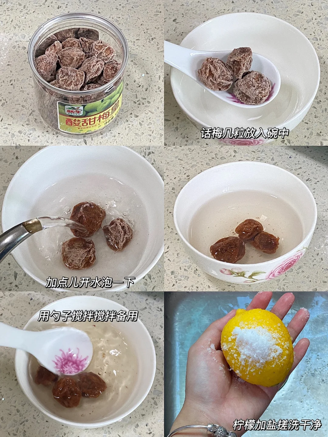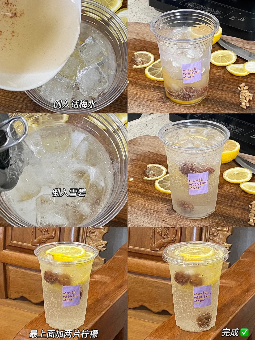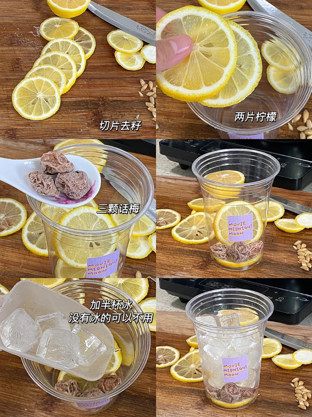 🍋食材:雪碧,话梅,冰块,黄柠檬。 🍋做法:1.话梅几粒放入碗中,用开水泡一会儿,用勺子搅拌搅拌备用。 2.柠檬加盐搓洗干净,切片去籽。 3.饮品杯中放入两片柠檬,几粒话梅,加半杯冰(如果没有冰块的也可以不用) 4.倒入话梅水,倒入雪碧,最上面再加上两片柠檬,完成✅ 🍋清爽解腻,酸酸甜甜好喝过瘾!!!