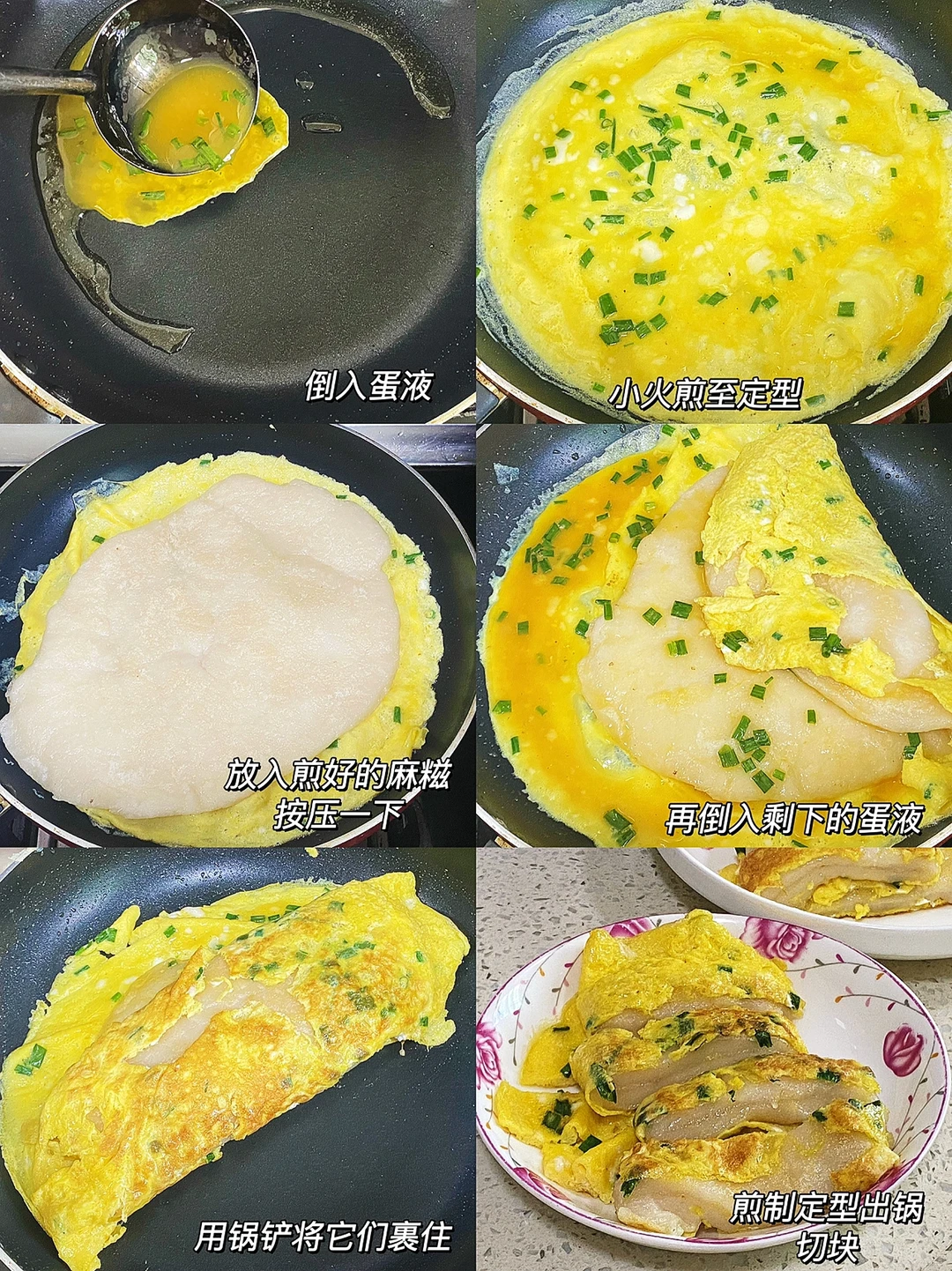 🧚♀️食材:糯米粉200g,鸡蛋三颗,小葱,胡椒粉,适量盐。 🧚♀️做法:1.糯米粉200g放入大碗中,加温开水用筷子搅拌成絮状,揉成光滑面团。 2.切一些葱花备用。 3.鸡蛋三颗,加盐、胡椒粉打撒,倒入葱花搅拌搅拌。 4.平底锅烧热油,放入麻糍,可以用锅铲按压一下。 5.小火煎至金黄,放入盘中备用。 6.倒入一半的蛋液,小火煎至定型,放入煎好糍粑,按压一下,再倒入剩下的蛋液,用锅铲将它们裹住,煎至定型出锅切块。 🧚♀️轻松复刻台州街边小吃,超级糯叽叽,巨巨巨好吃!