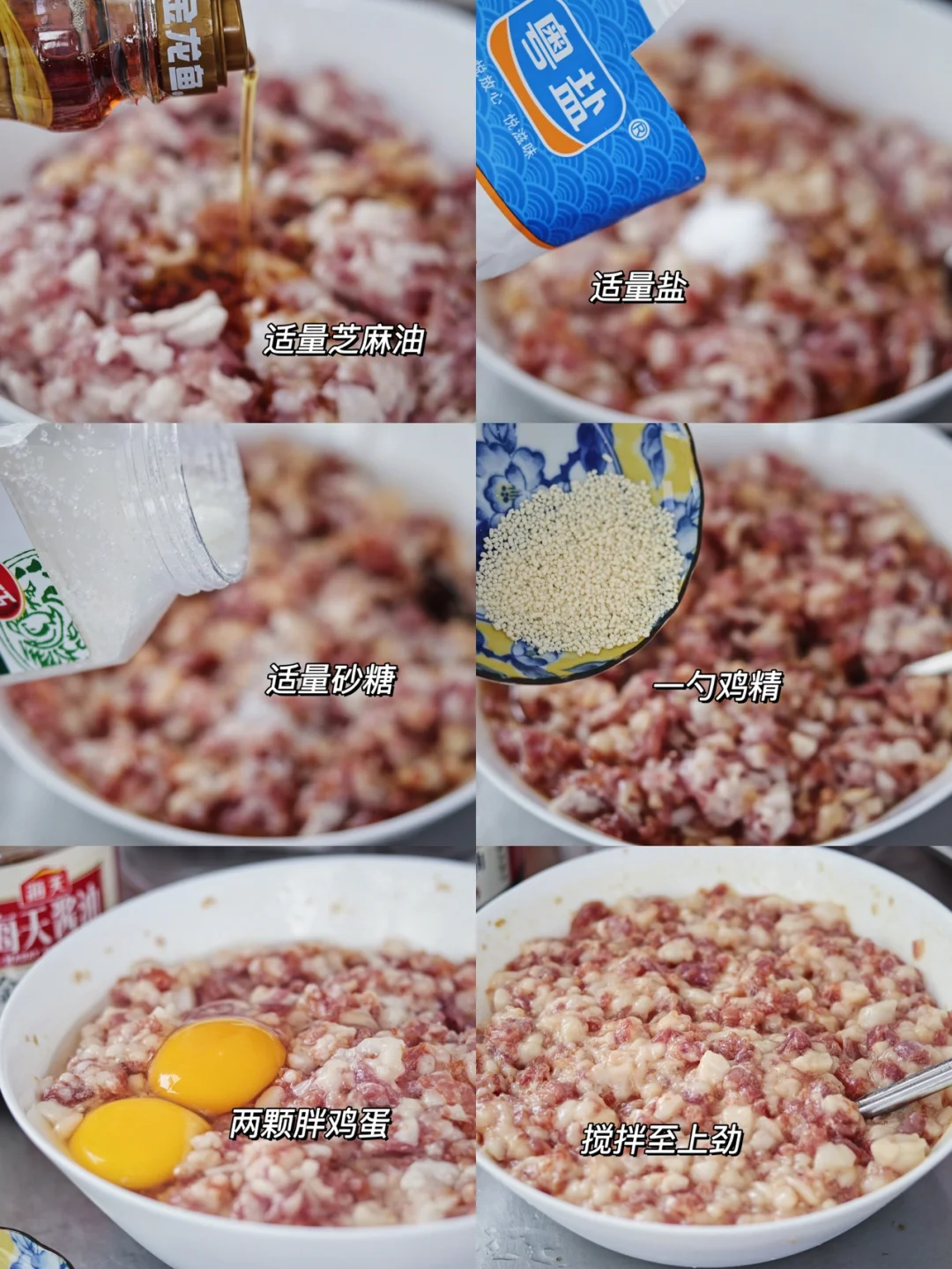 2.猪肉洗净剁碎,两勺生抽、适量芝麻油、适量盐、适量砂糖、1勺鸡精、两颗胖鸡蛋,搅拌上劲。