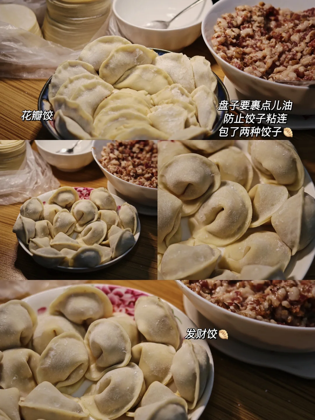 5.盘子要裹点儿油防止饺子粘连,包了两种饺子,花瓣饺/发财饺。