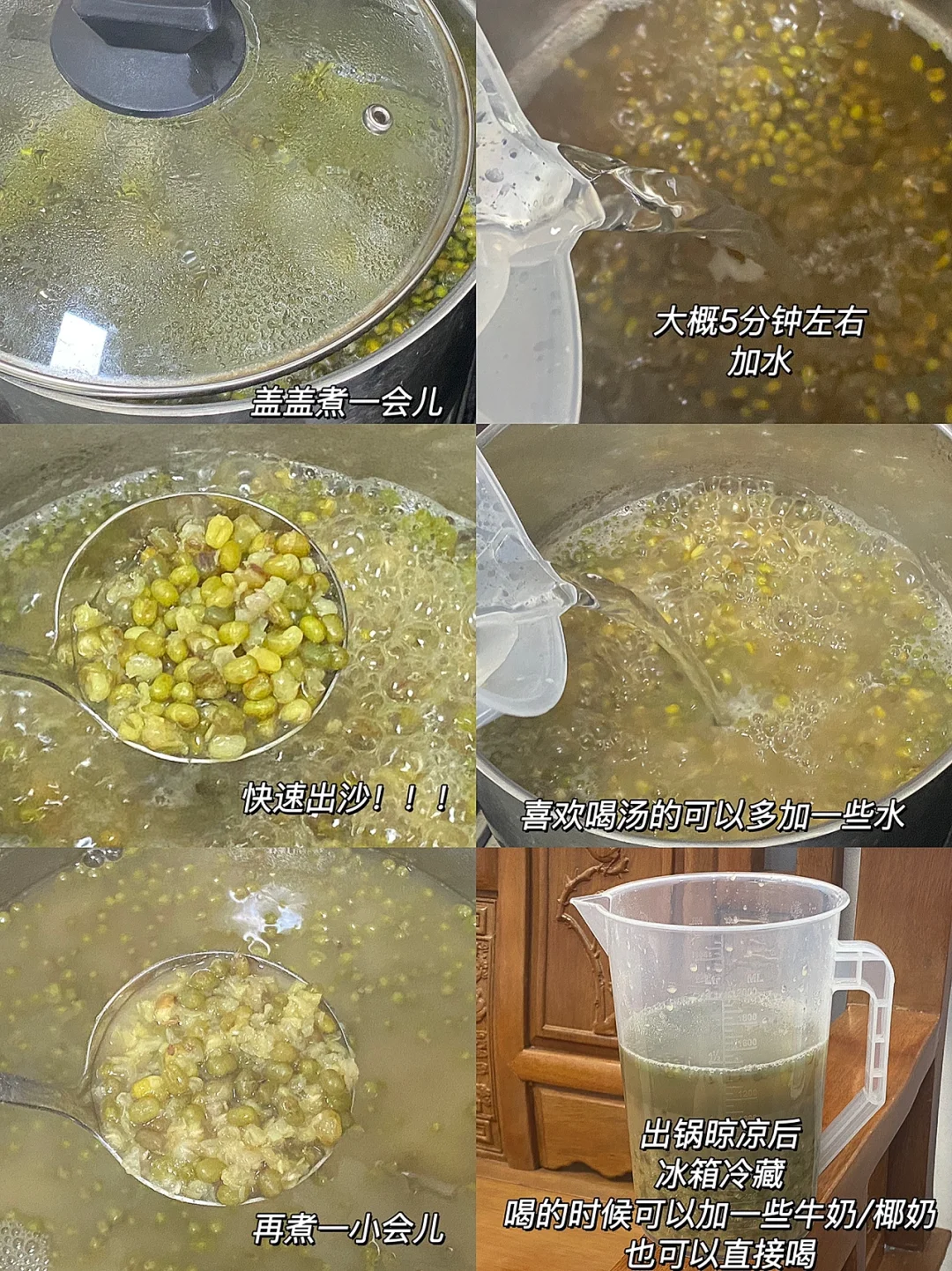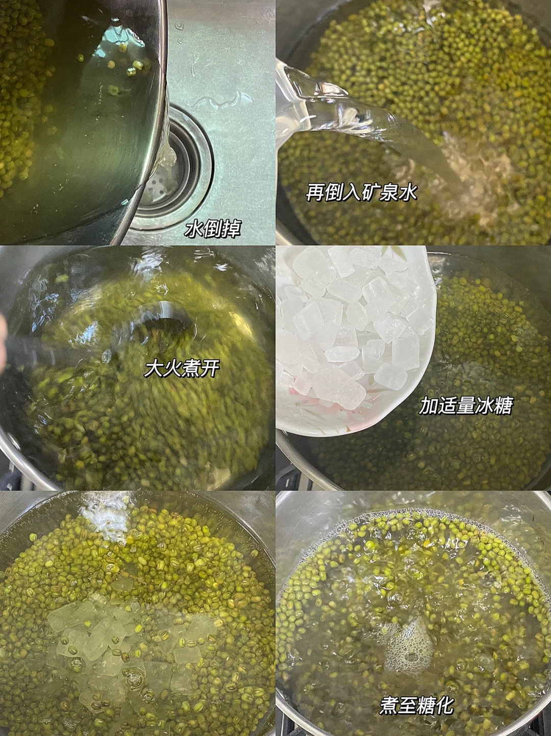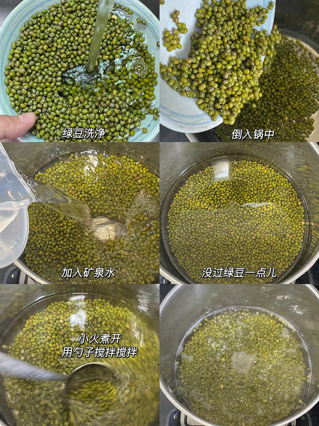 🧚♀️做法:1.绿豆洗净,倒入锅中,加入矿泉水,没过了都一点儿绿豆,小火煮开,用勺子搅拌搅拌(大概三分钟)