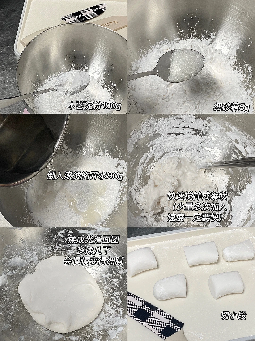 🌷做法:1.木薯淀粉100g,细砂糖5g,倒入滚烫的开水80g快速搅,下手揉成光滑面团,多揉几下会变得细腻。