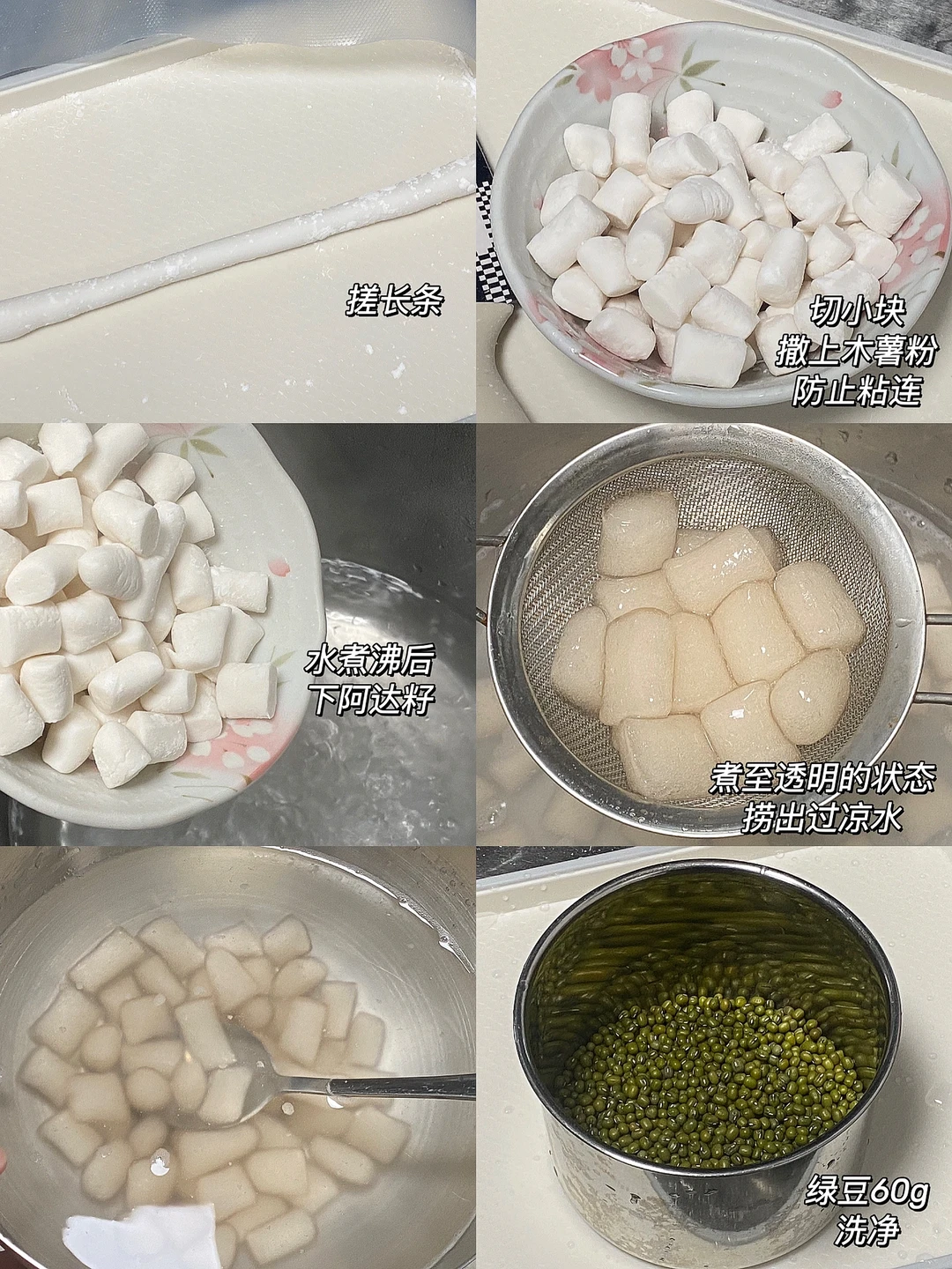 🌷食材:木薯淀粉100g,绿豆60g,细砂糖5g(加入到木薯淀粉里的)开水80g。