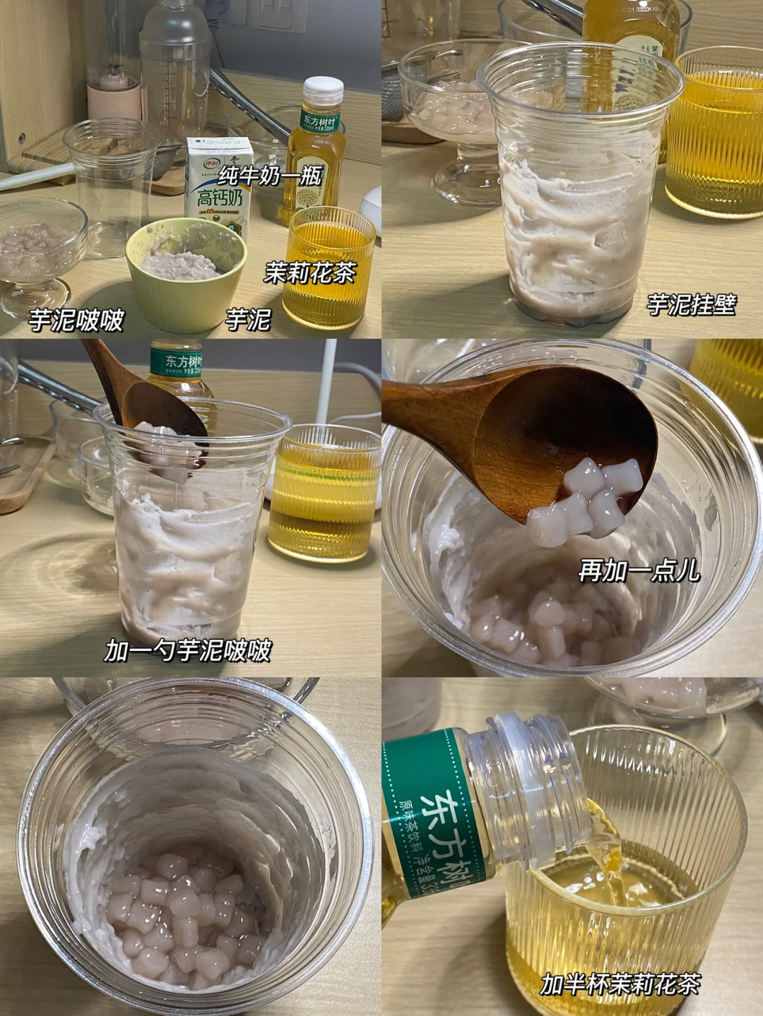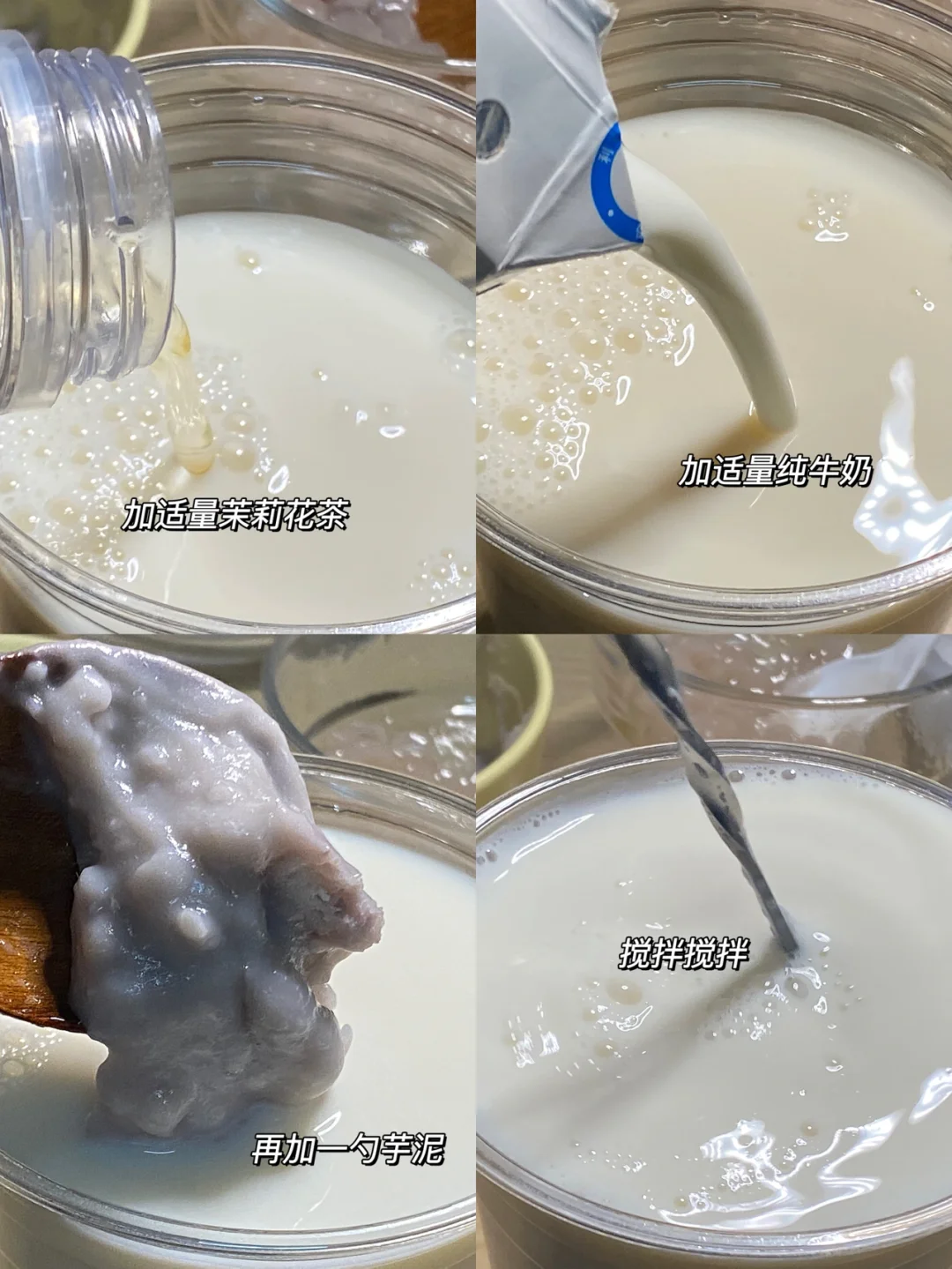 🥛食材:纯牛奶,芋泥,芋泥啵啵,茉莉花茶。 🥛做法:1.芋泥挂壁,加入一勺啵啵。 2.准备一个小杯子,加入半杯的茉莉花茶,再半杯的纯牛奶,用吧勺搅拌搅拌,搅拌后倒入饮品瓶中。 3.加适量茉莉花茶,加适量纯牛奶,最后再加一勺芋泥,再用吧勺搅拌搅拌。 🥛自己做料超级足的哦!