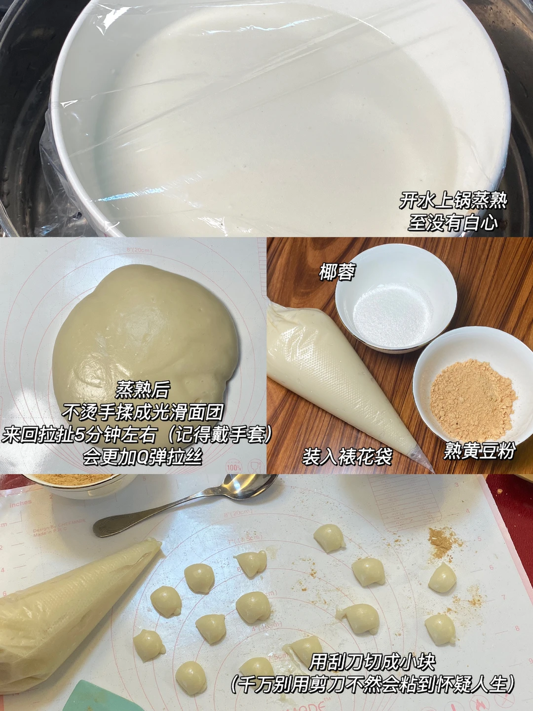 5.建议用刮刀来切块,不建议用剪刀,不然会粘到怀疑人生,粘上椰蓉、黄豆粉真的太诱人啦!!!