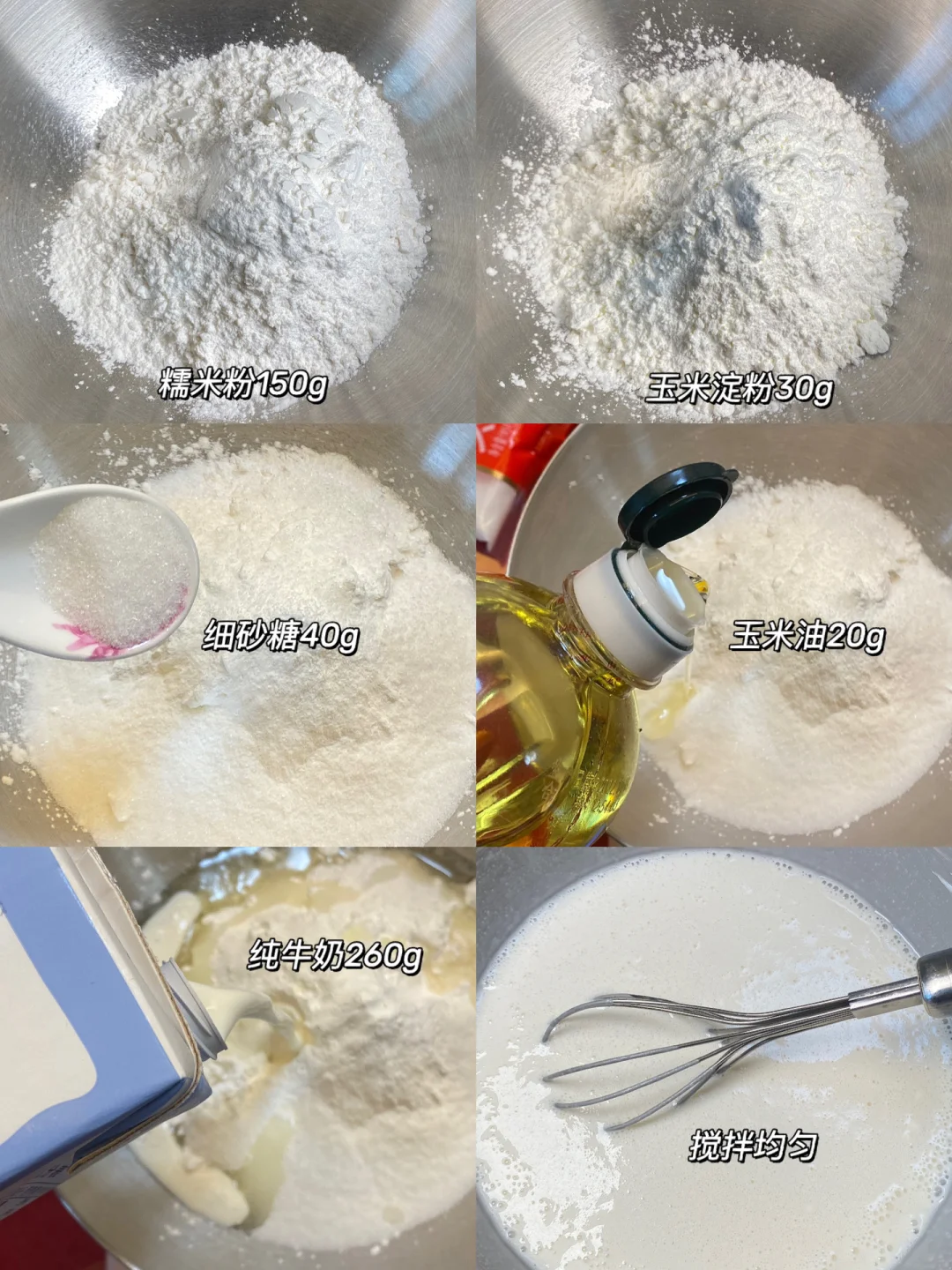 👩🏻🍳做法:1.糯米粉、玉米淀粉、细砂糖、玉米油、纯牛奶搅拌均匀。