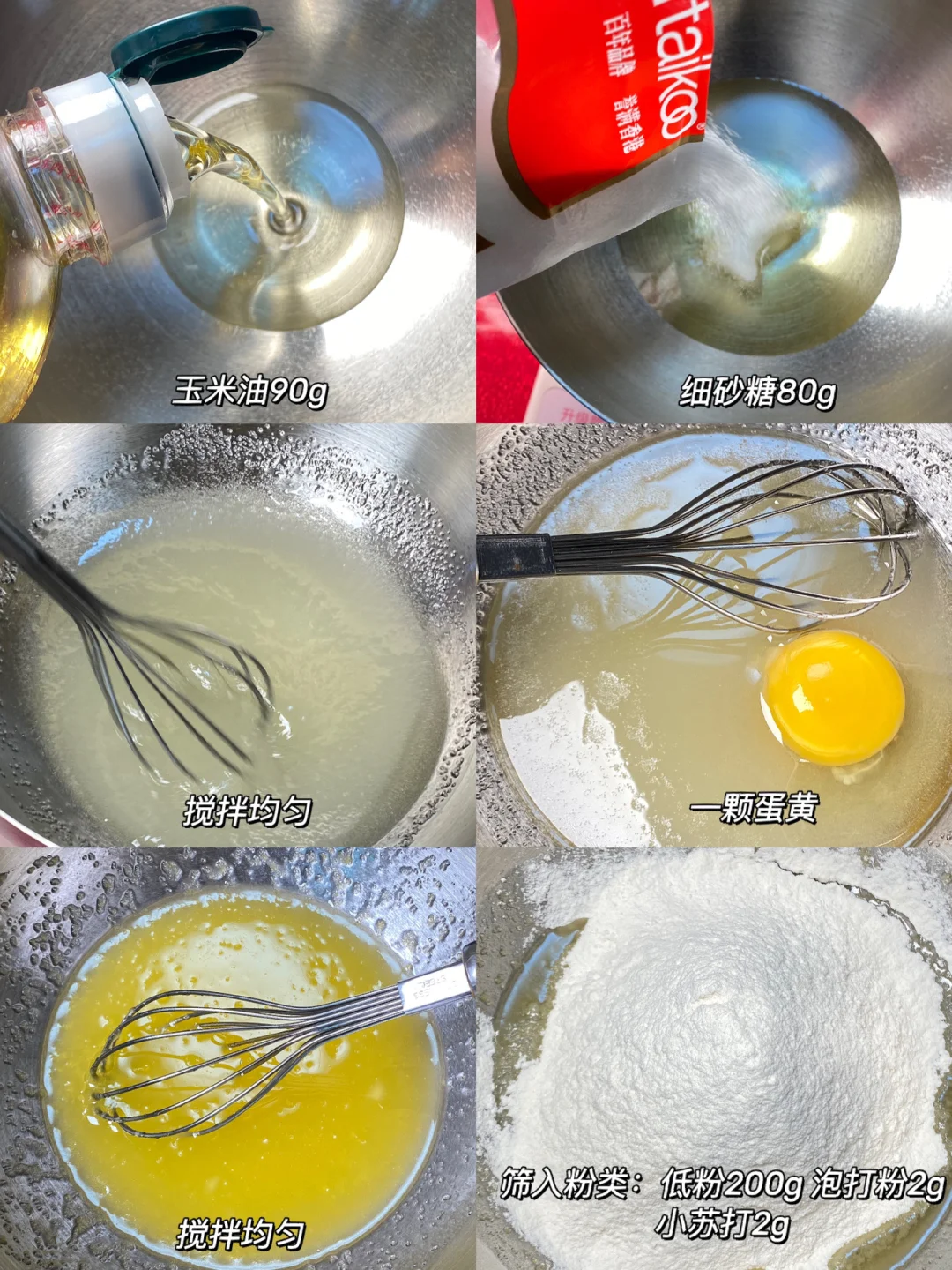 🥜做法:1.玉米油、细砂糖搅拌均匀。