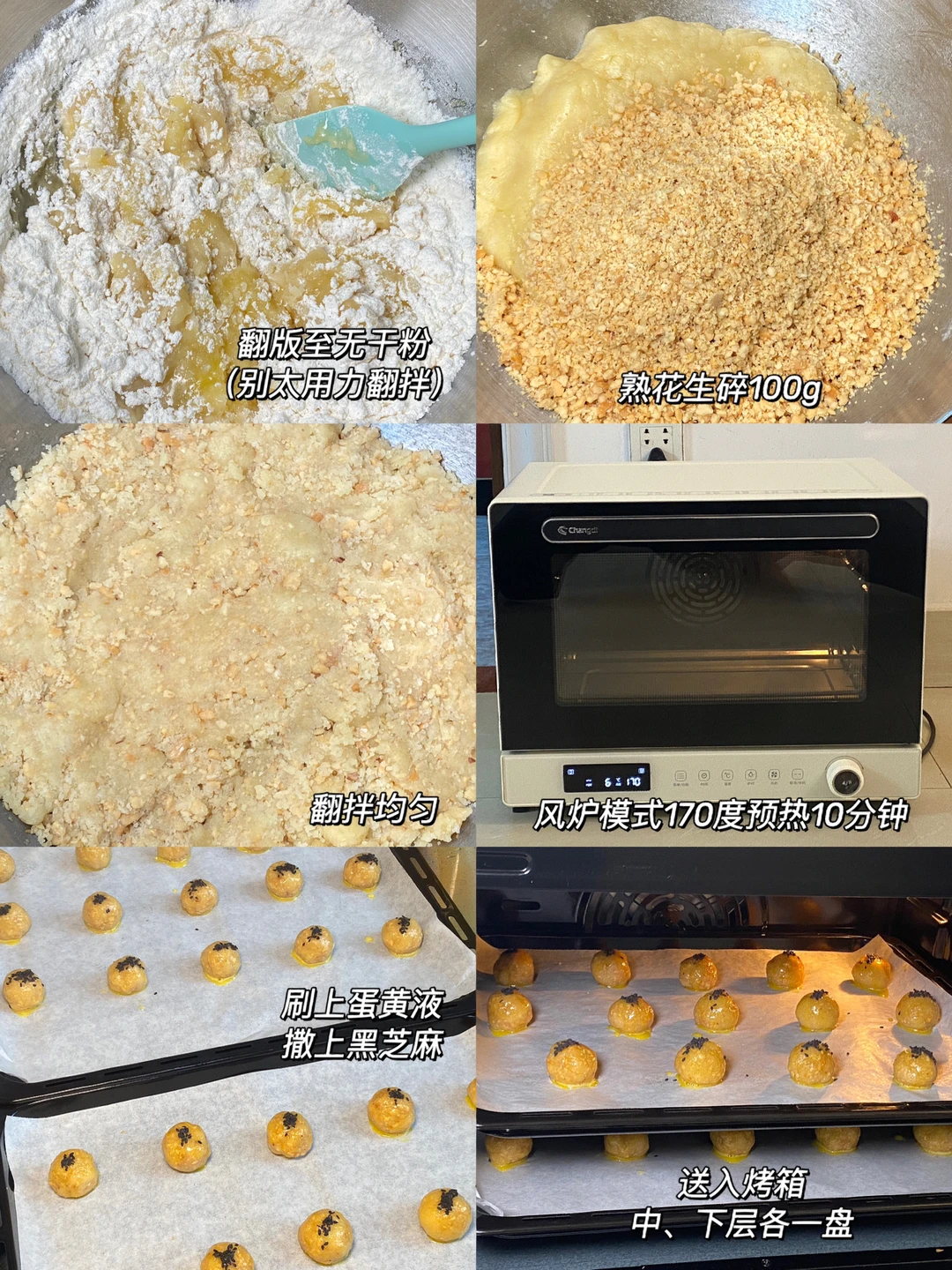 🥜食材:低筋面粉200g,熟花生碎100g,蛋黄2个(一个用在面团,另外一个用来刷表面)玉米油90g,细砂糖80g,泡打粉2g,小苏打2g(不喜欢小苏打的可以不加,苏打可以减少但不要加多,会苦)黑芝麻适量。
