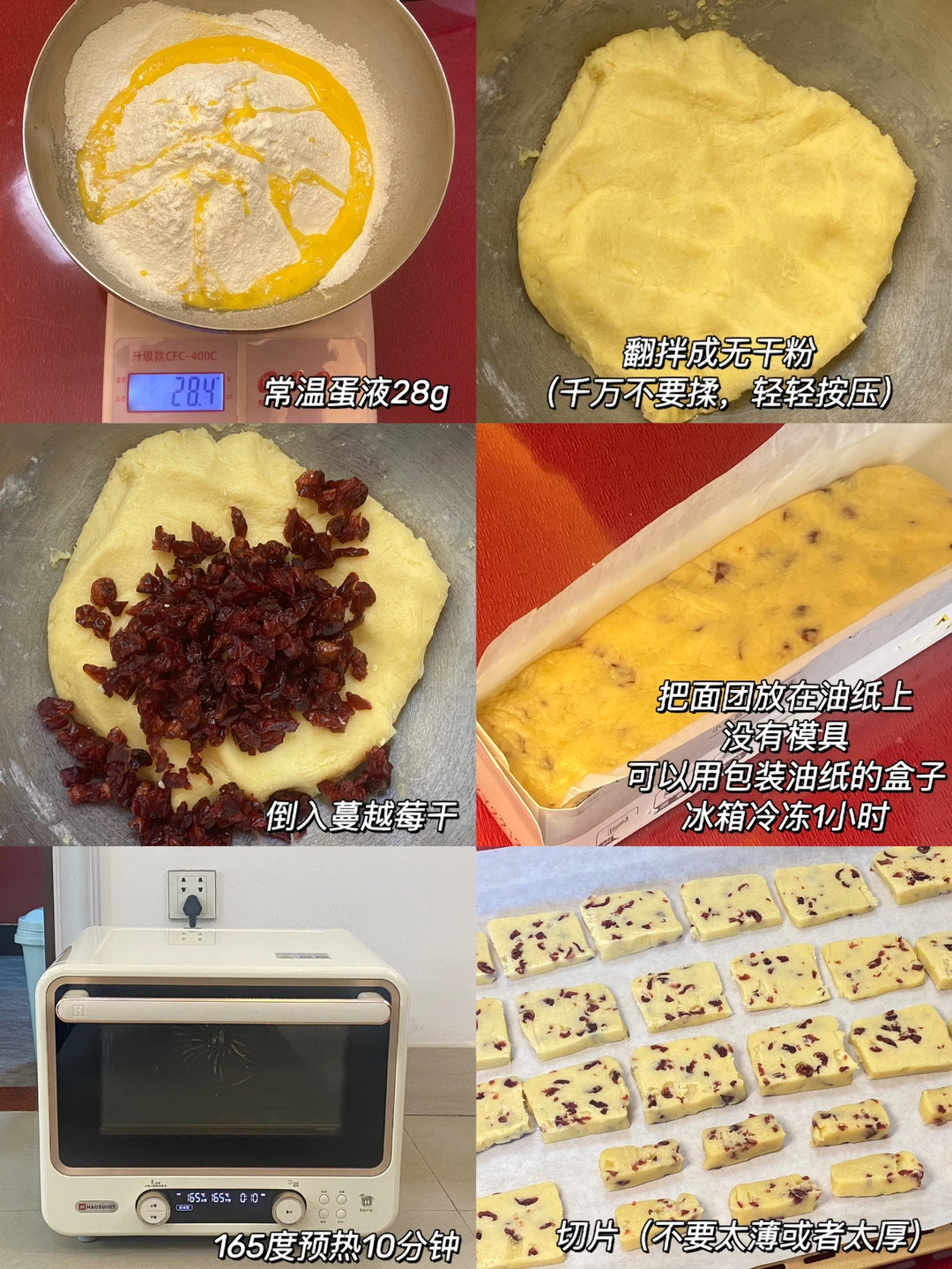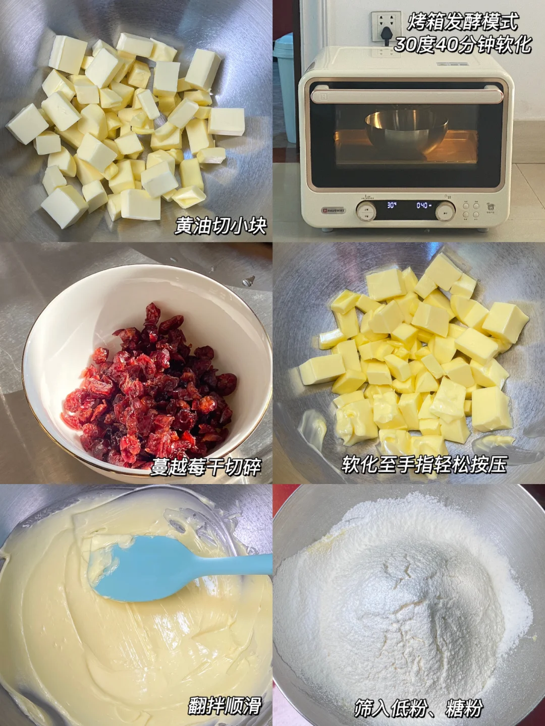 👩🏻🍳食材:黄油110g,糖粉60g,低筋面粉180g,常温蛋液28g,蔓越莓干50g。