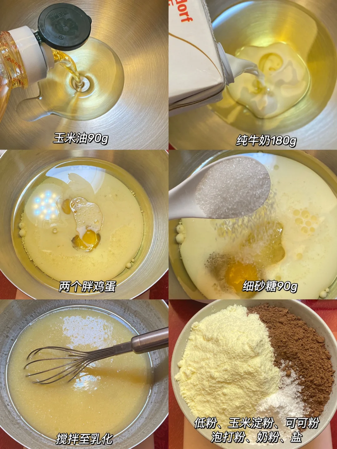 玉米油90g,纯牛奶180g,两颗胖鸡蛋,细砂糖90g,低粉150g,玉米淀粉30g(可以使蛋糕更松软)可可粉30g(可以稍微减少一点)泡打粉10g,奶粉30g(增加奶香味)盐1g。