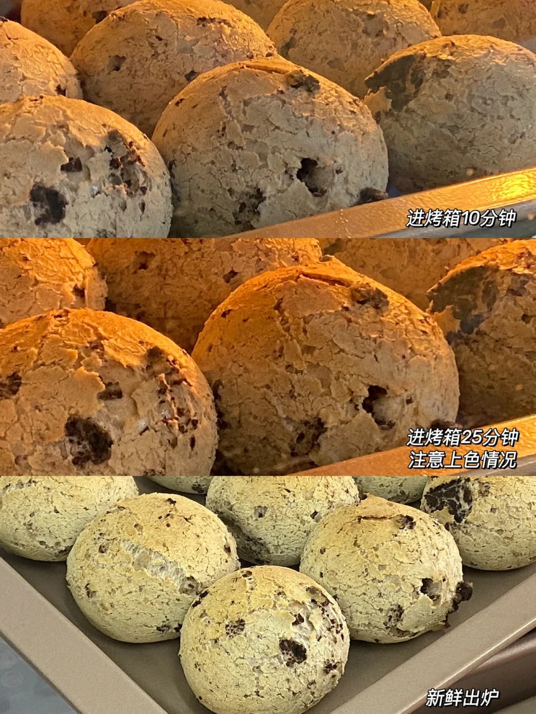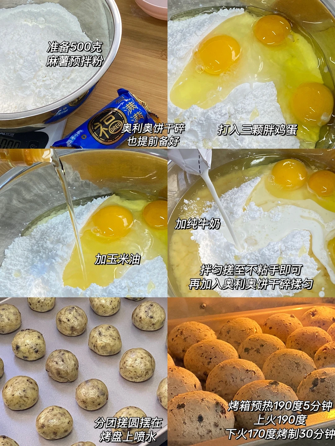 🍪食材:纯牛奶150克,鸡蛋150克,麻薯预拌粉500克,玉米油150克,奥利奥饼干碎适量大概60克。 🍪做法:1.准备500克麻薯预拌粉。 2.打入鸡蛋。 3.加入玉米油、纯牛奶。 4.搅拌均匀,搓至不粘手即可,再加入奥利奥饼干碎揉匀。 5.分团搓圆后摆在烤盘上,喷水。 6.烤箱190度预热五分钟,上火190度,下火170度烤制30分钟左右,要注意上色情况,别烤过啦! 🍪出炉后要趁热吃,糯叽叽软糯拉丝[赞R][赞R][赞R]
