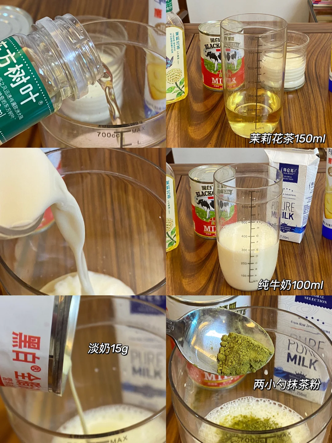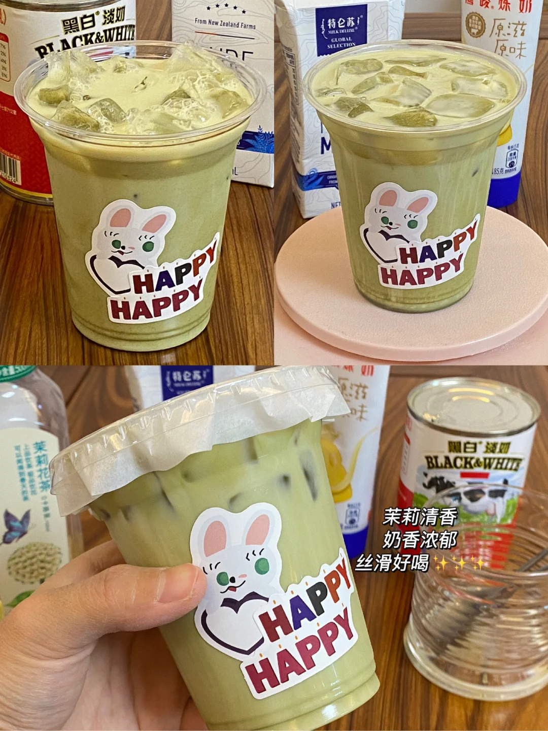 🍃食材:茉莉花茶,纯牛奶,淡奶,抹茶粉,炼乳。 🍃做法:1.茉莉花茶150ml(东方树叶),加入纯牛奶150ml,再倒入淡奶15g。 2.加两小勺抹茶粉,几圈炼乳(喜甜的可以多加一点)雪克一下!!! 3.饮品杯中加冰块,倒入杯中。 4.在加入15g淡奶点缀一下。 🍃茉莉清香,奶香浓郁,丝滑好喝,狠狠爱住[赞R][赞R][赞R]
