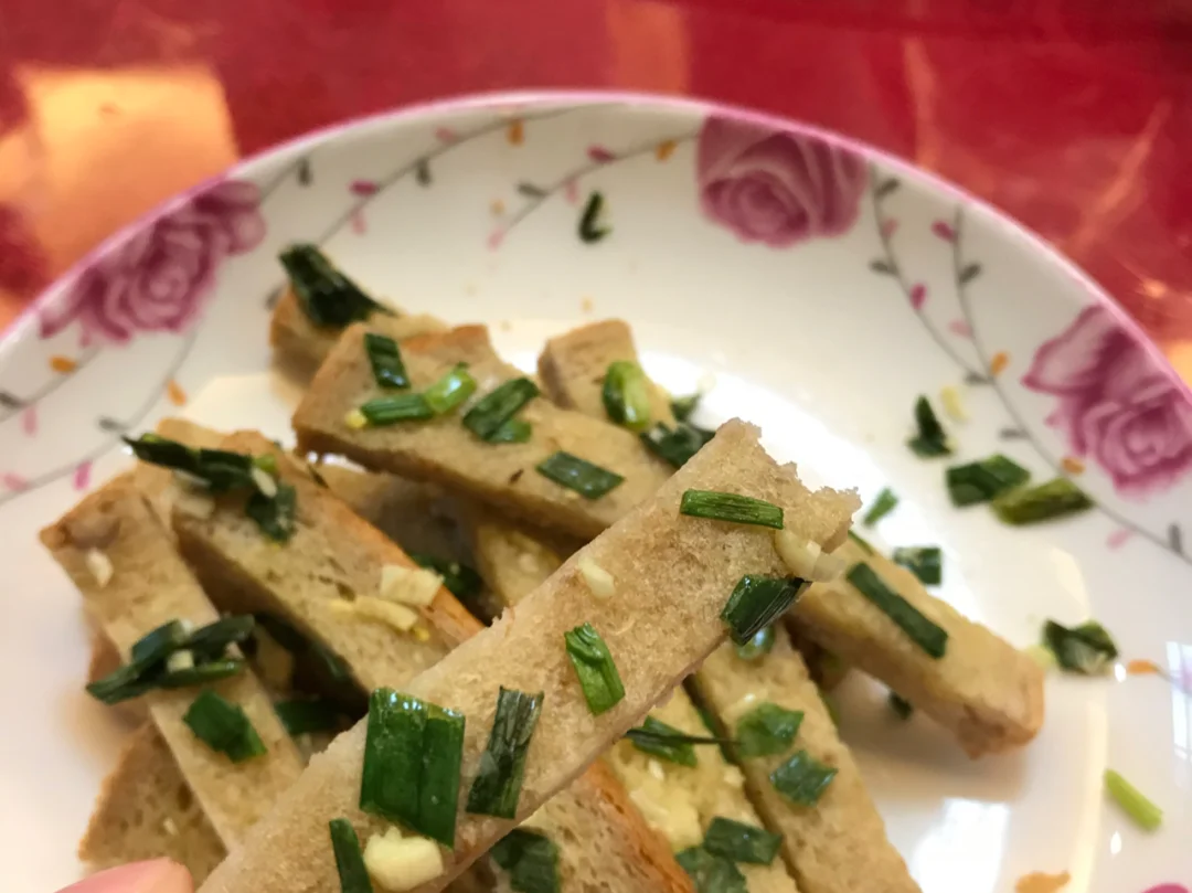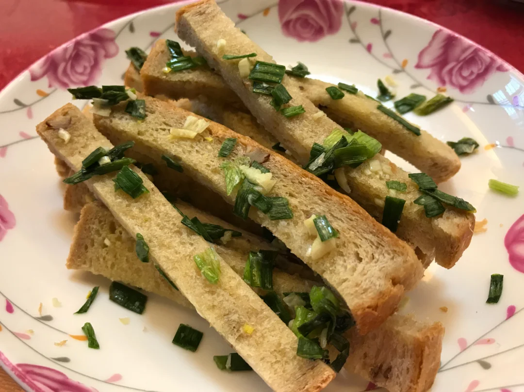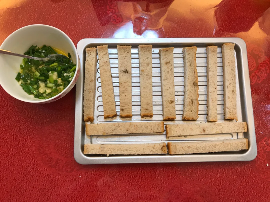 食材:吐司2片、无盐黄油30克、葱花10克、蒜适量、盐1克 做法:1.吐司切成条状,黄油隔热水融化,将蒜葱切成末加适量盐与黄油搅拌 2.再用刷子把每根吐司条刷上黄油葱蒜末酱 3.烤箱190度预热,再烘烤10分钟 香喷喷的葱香蒜末吐司条就做好啦!🤩