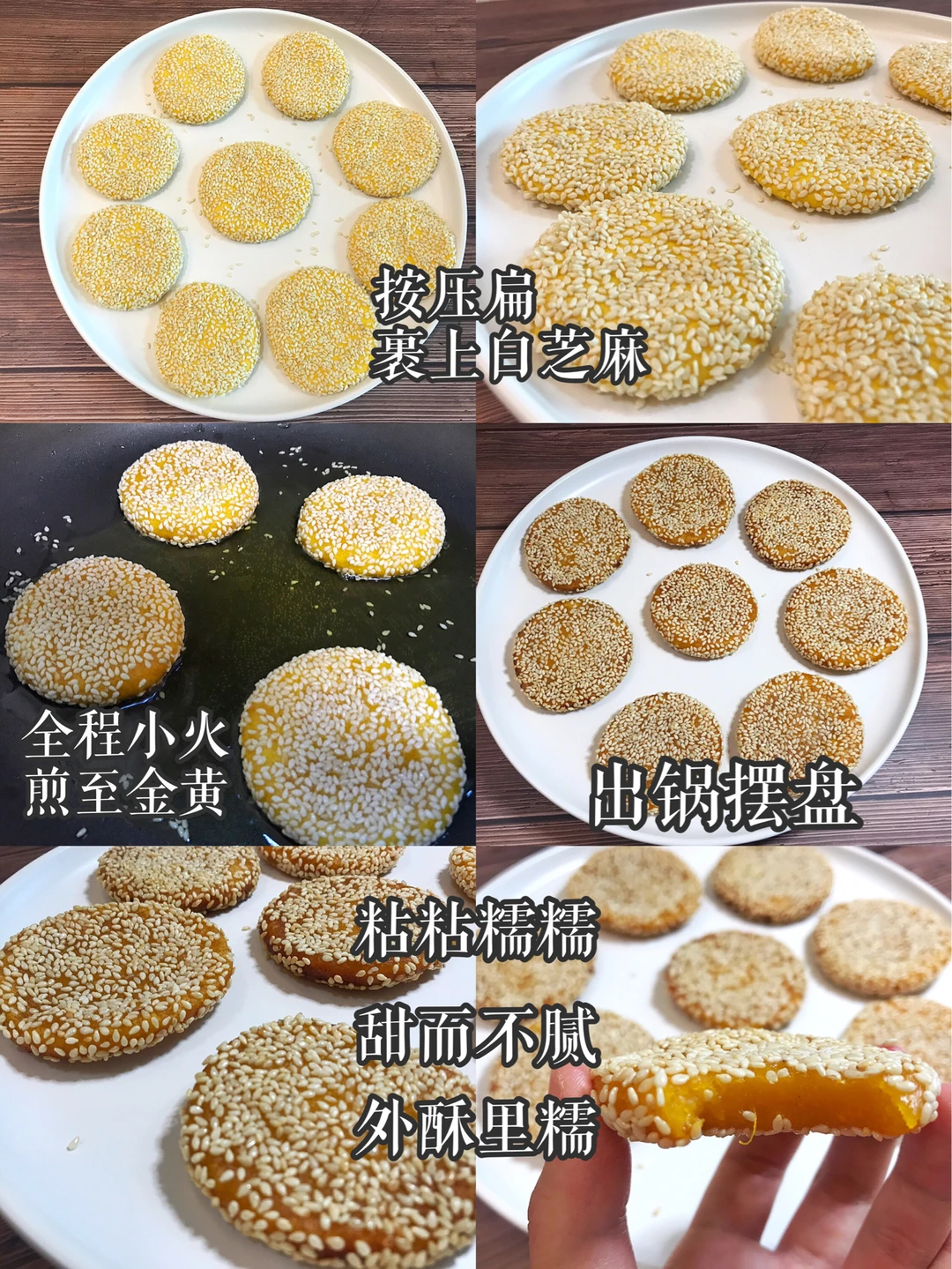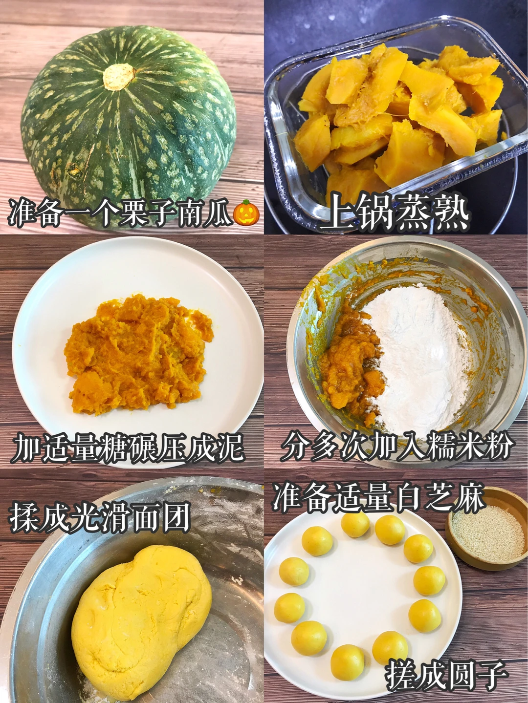 超简单,快做起来鸭😆 🎃食材:100克栗子南瓜,白砂糖20克,250克糯米粉,白芝麻适量。 🎃做法:1.栗子南瓜去皮切块,上锅蒸熟。 2.放进盘中用勺子🥄碾压成泥。 3.加糖、糯米粉分次加入揉成光滑面团。 4.提前准备好白芝麻,搓成一个个小球,微微按扁,再裹上白芝麻。 5.平底锅🍳全程小火慢煎,用玉米油丨调和油都可以,煎至两面金黄即可出锅,装盘。 🎃1.凉了之后吃口感会更棒哦! 2.也可用果汁机搅成泥,这样会更细腻。 3.全程一定一定一定要小火,要有耐心。