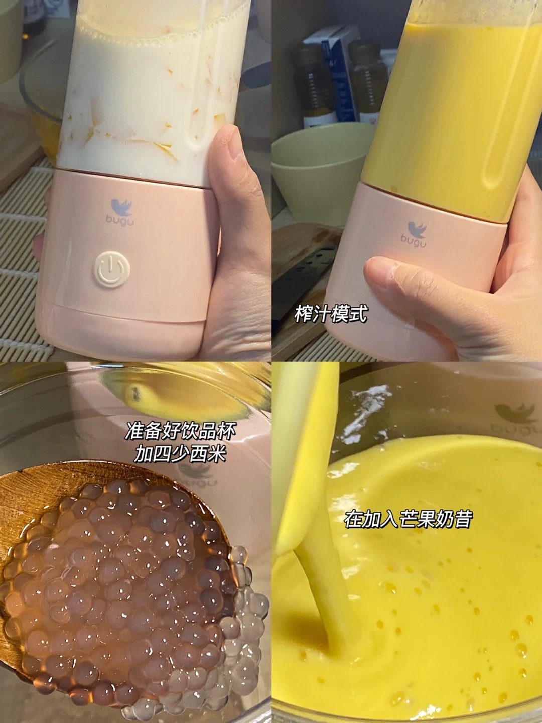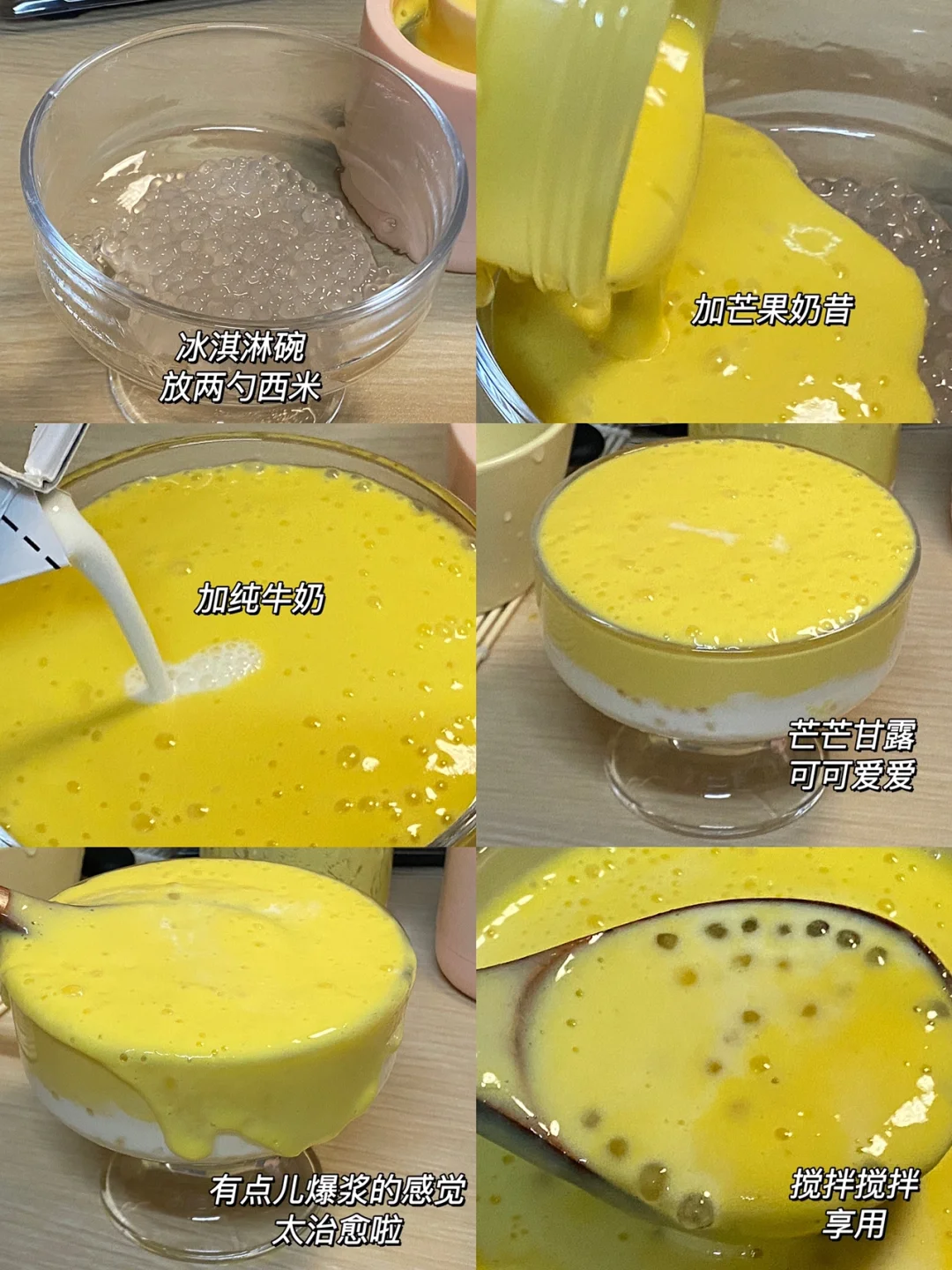 6.还做了小份的,准备个玻璃杯或者小碗,加两勺西米,再加入芒果奶昔,最后加纯牛奶,完成✅