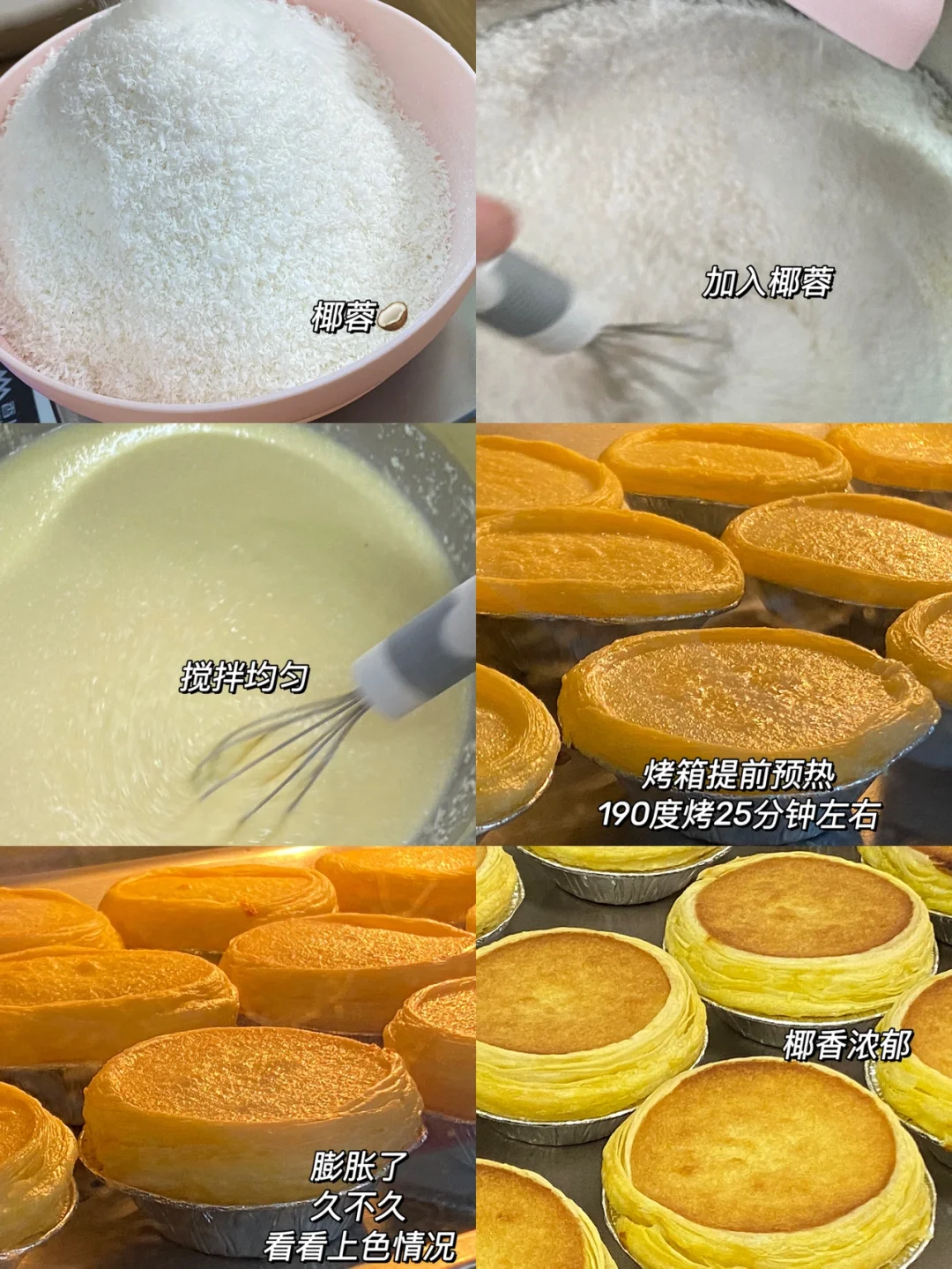 🥥食材:蛋挞皮20个,鸡蛋四个,白砂糖100克,纯牛奶240克,玉米油80克,低筋面粉60克,椰蓉160克。 🥥做法:1.准备一个无水无油的盆子,加牛奶、砂糖、鸡蛋、筛入低筋面粉,搅拌均匀。 2.过筛一遍,加入椰蓉,搅拌均匀。 3.烤箱提前预热,蛋挞皮解冻五分钟左右放在烤盘上。 4.190度烤制30分钟,中途要注意观察上色情况。烤温还是要根据自家烤箱而定哦! 🥥椰香浓郁,咬一口巨满足[赞R][赞R][赞R]