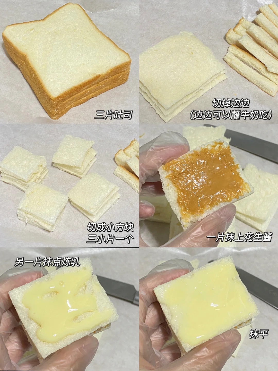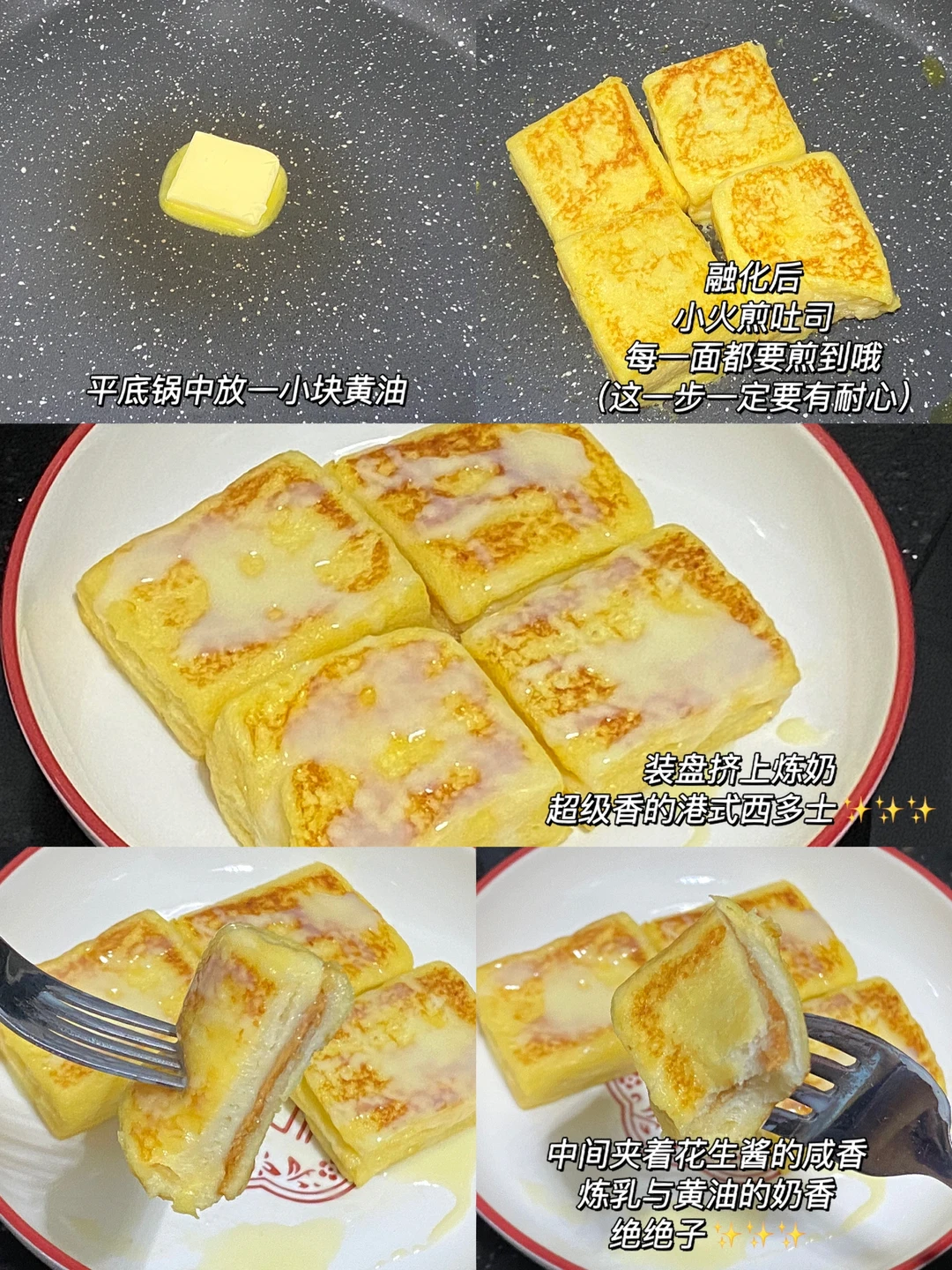 🍞食材:吐司,花生酱,炼乳,黄油,鸡蛋,牛奶。 🍞做法:1.三片吐司切掉边边,再切成小方块,三小片一个。 2.一片抹上花生酱,另一片抹上炼乳,抹平,再放一片吐司按压紧实一点。 3.蛋奶液(鸡蛋➕牛奶50g搅拌均匀)吐司每一面都要蘸上蛋奶液。 4.平底锅放一小块黄油,融化后,小火煎吐司,每一面都要煎到哦(这一步一定要有耐心) 🍞装盘后,挤上炼乳,超级香的港式西多士就诞生啦! 🍞中间夹着花生酱的咸香,炼乳与黄油的奶香,绝绝子呀[赞R][赞R][赞R]