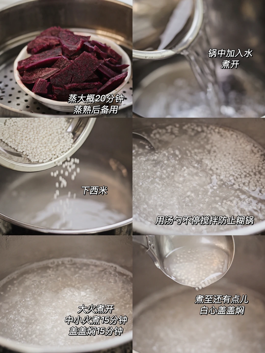5.加适量冰糖、牛奶、适量炼乳、加入蒸好的紫薯,加入西米,再煮10分钟左右搅拌搅拌即可出锅。