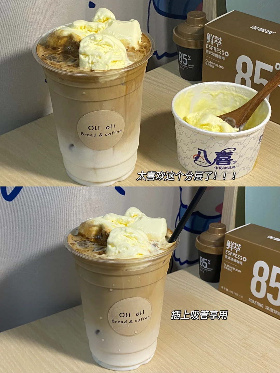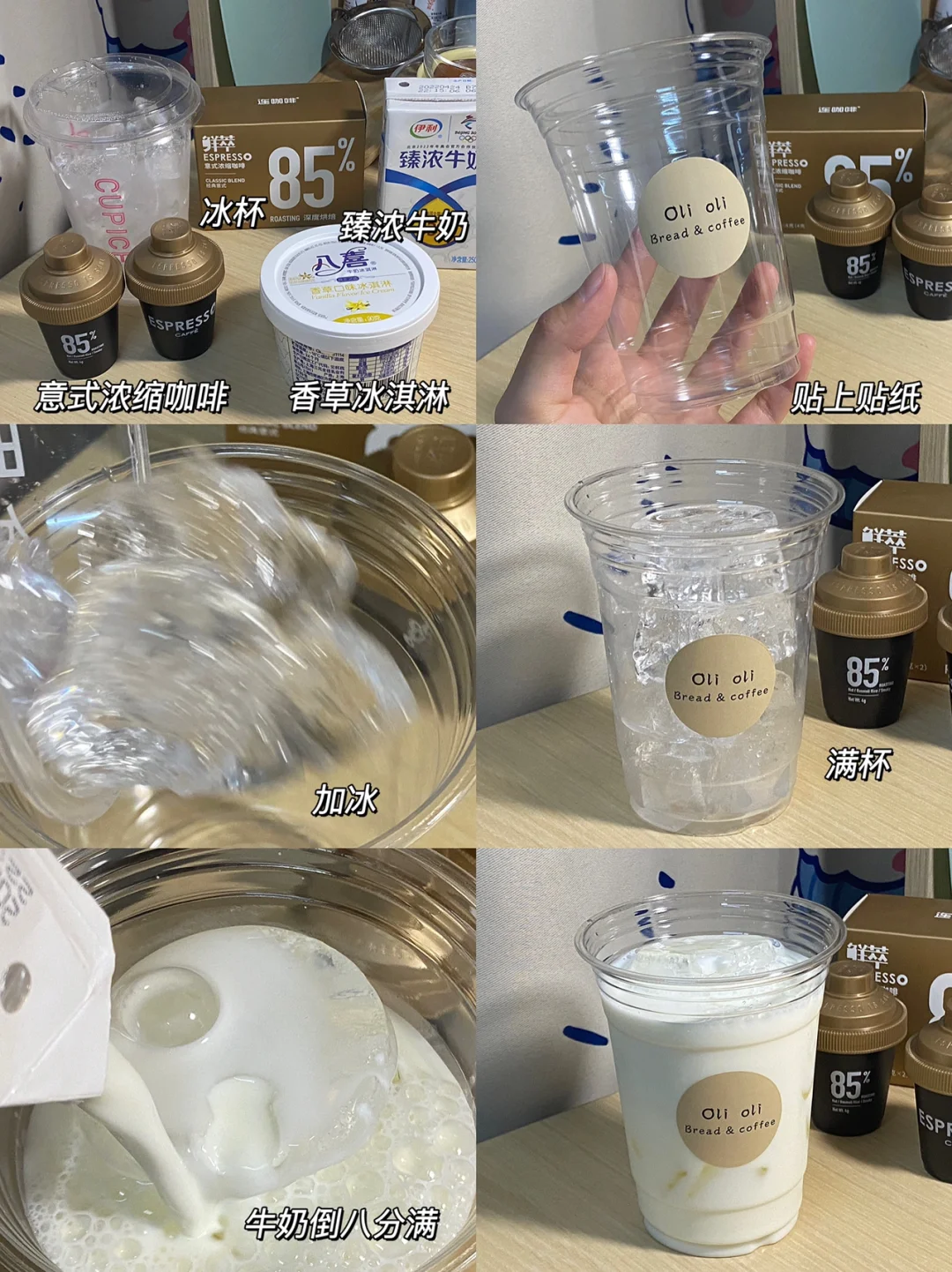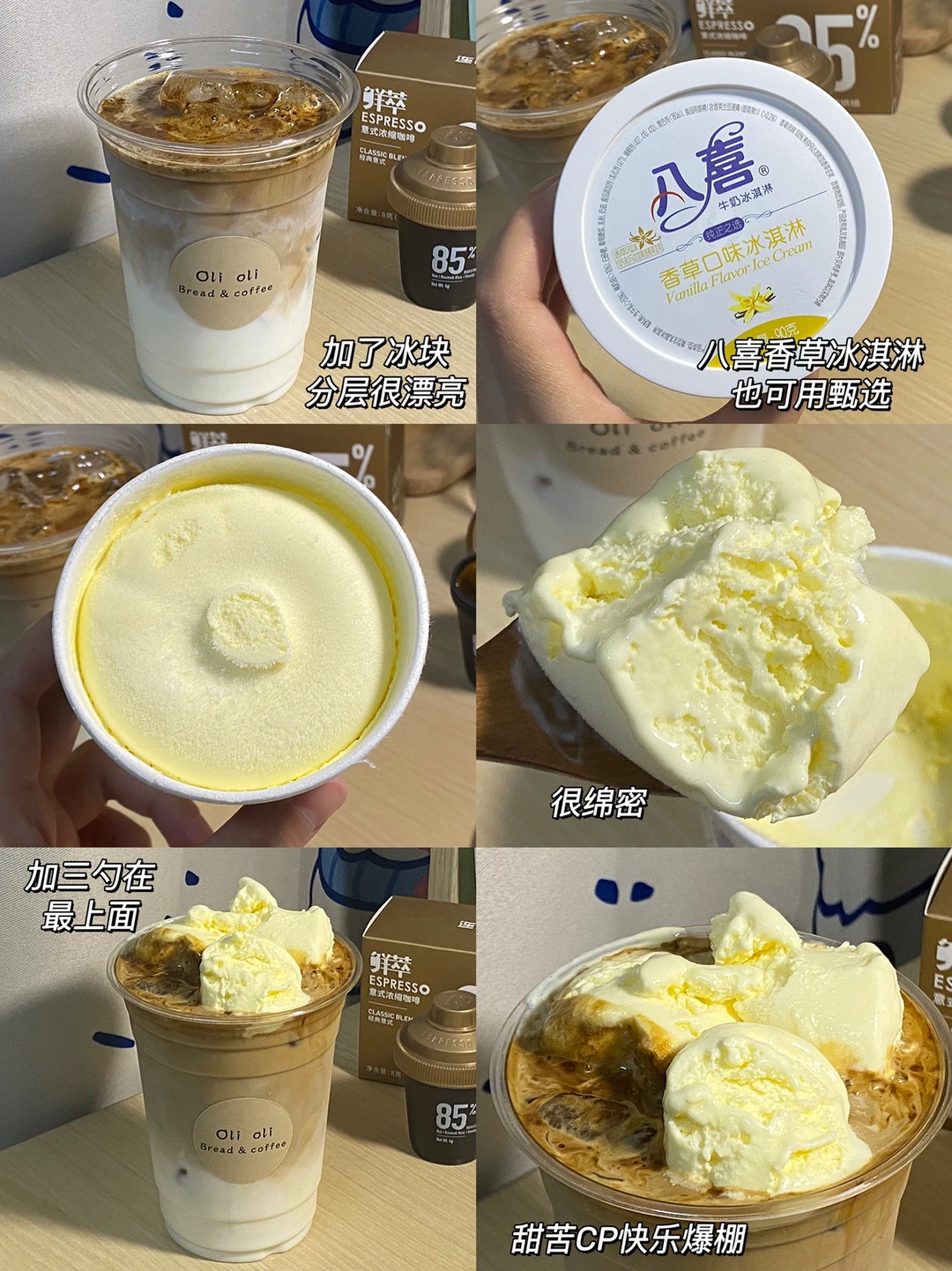 🌿食材:香草冰淇淋,臻浓牛奶,冰杯,咖啡粉。