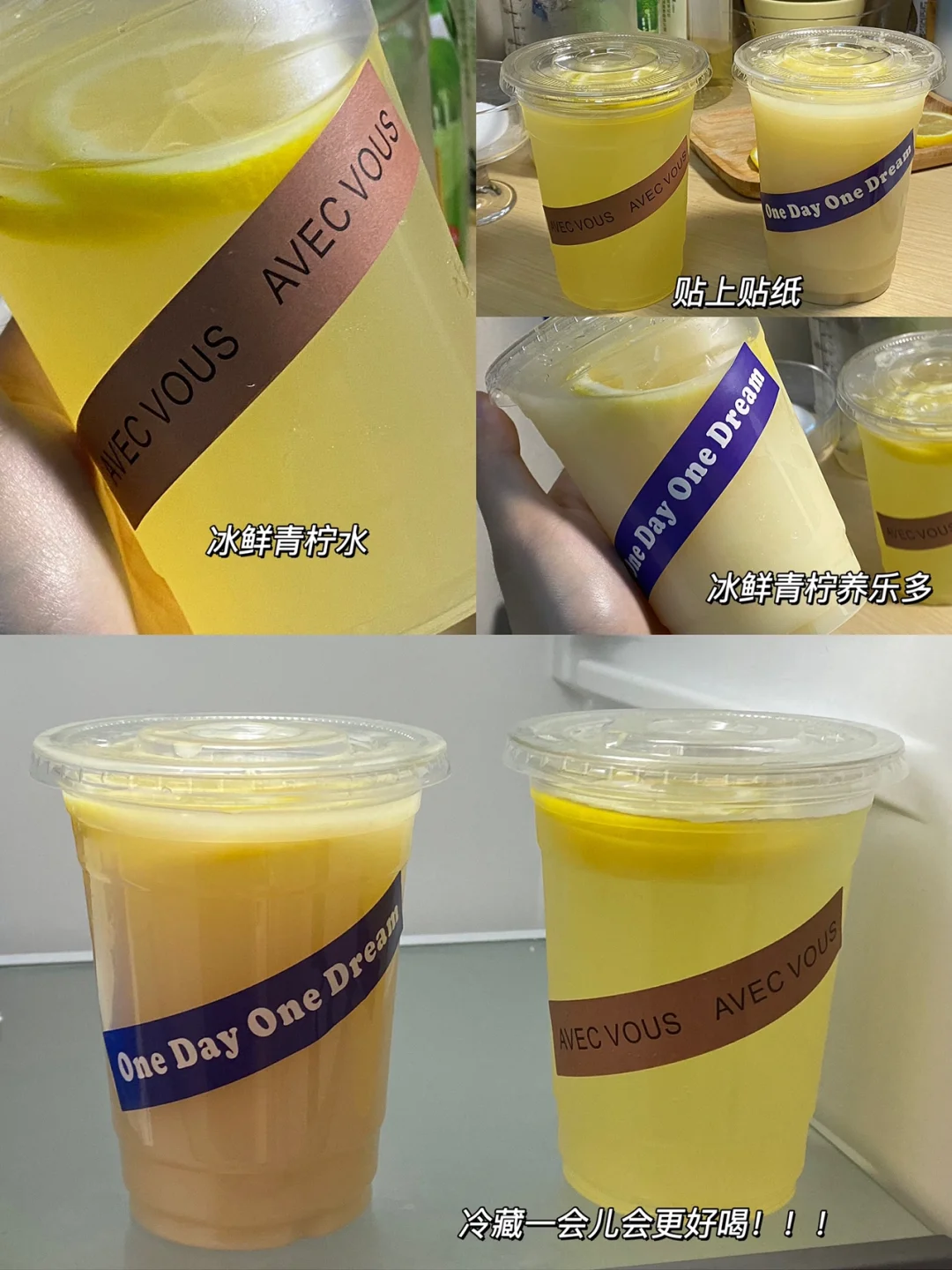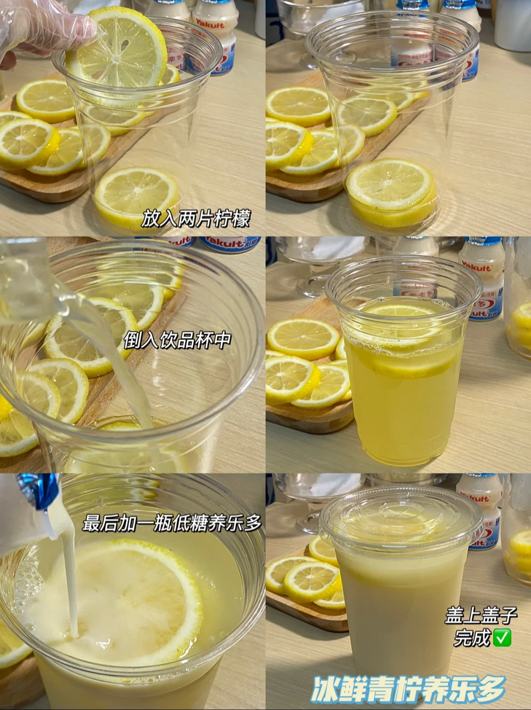 4.放两片柠檬到饮品杯中,倒入饮品杯中,最后加一瓶低糖养乐多,盖上盖子,完成✅