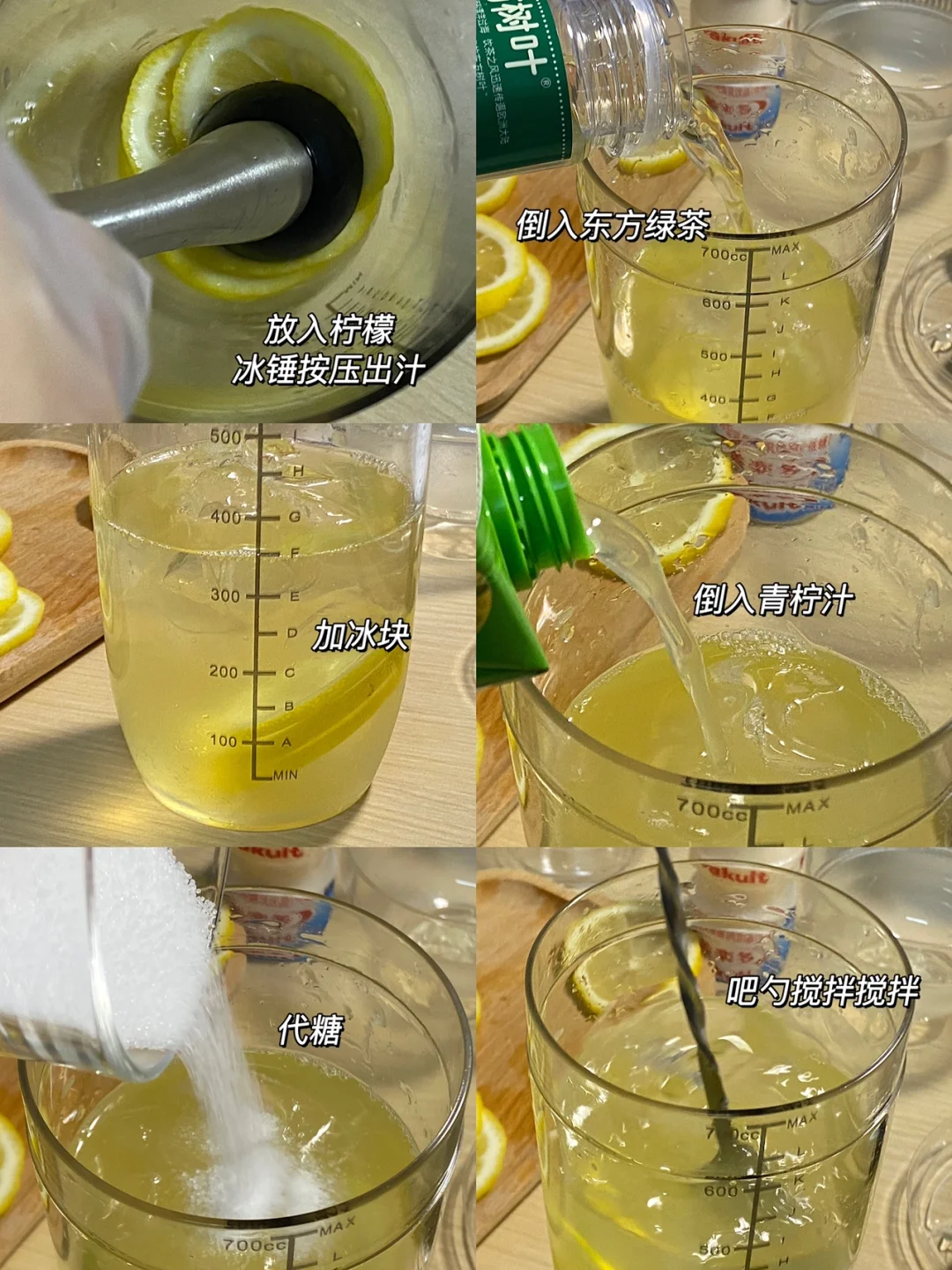 🍋食材:东方绿茶,佰恩氏小青柠汁,柠檬,低糖养乐多,冰块,代糖。