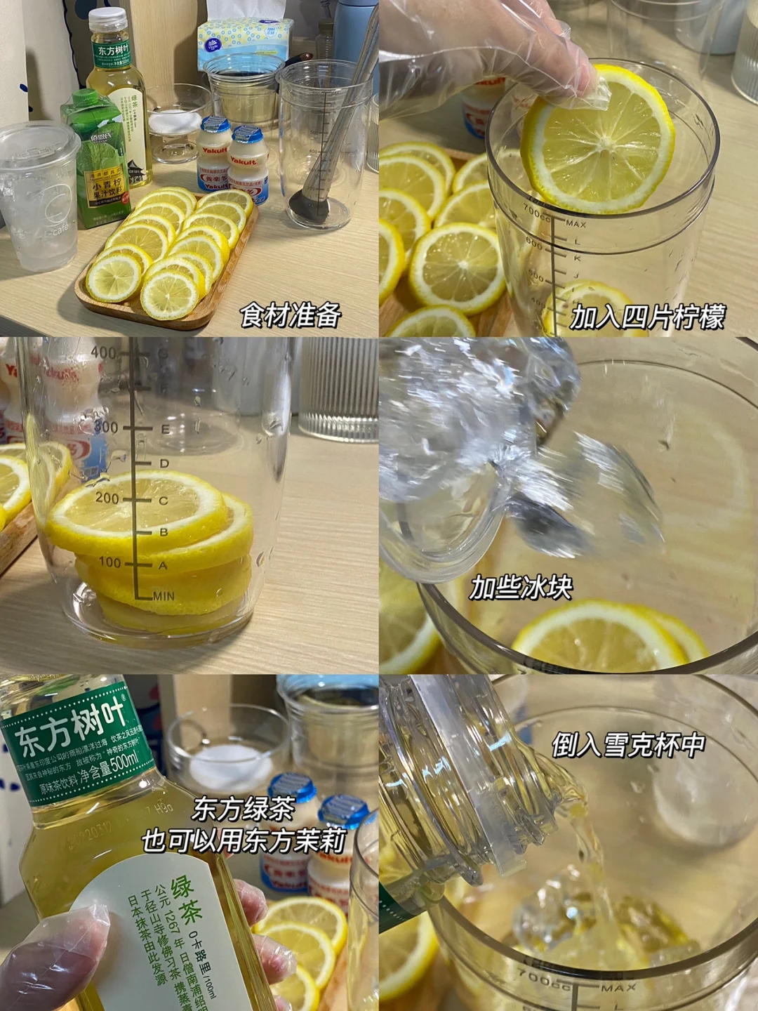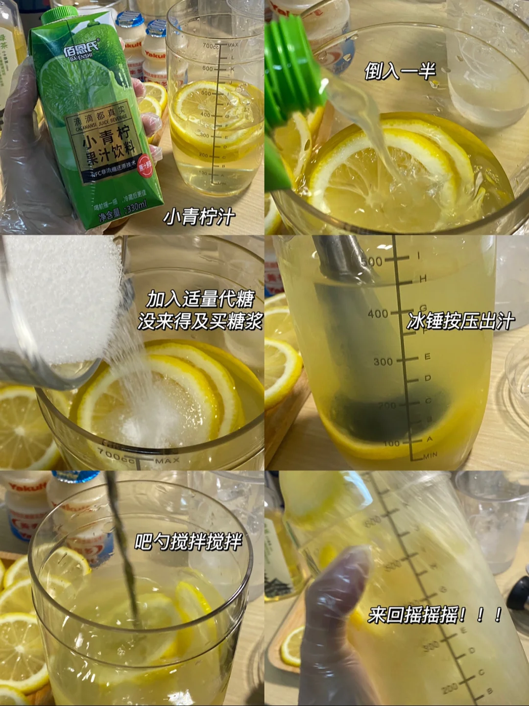 🍋冰鲜青柠养乐多做法:1.雪克杯加四片柠檬,加一些冰块,倒入东方绿茶,倒一半的小青柠汁,再加入适量代糖,冰锤按压出汁。