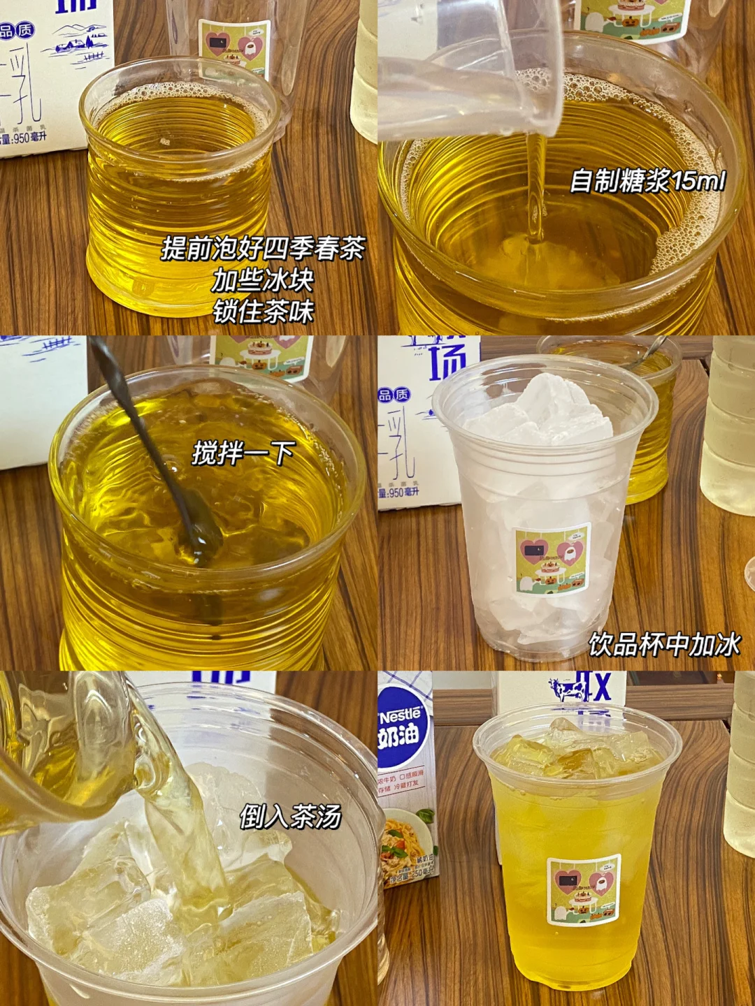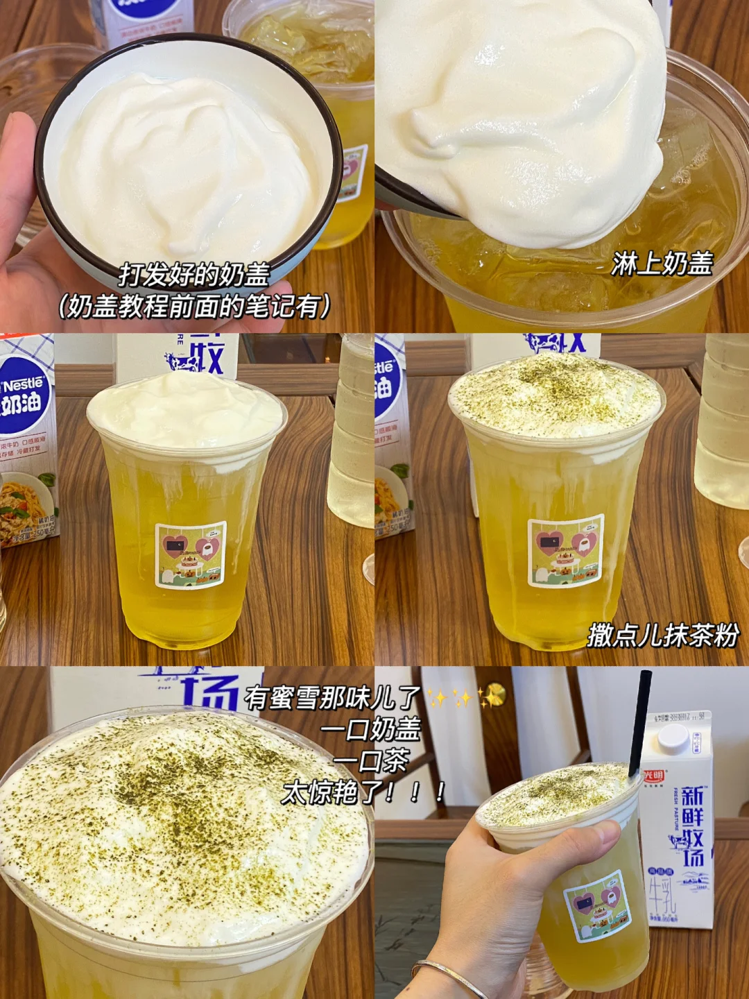 🌼食材:四季春,奶盖,糖浆,冰块,抹茶粉。 🌼做法:1.四季春茶泡5分钟左右,加点儿冰块锁住茶味儿。 2.自制糖浆15ml,搅拌一下。 3.饮品杯中加冰,倒入茶汤。 4.淋上提前打发好的奶盖(奶盖教程前面的笔记有) 5.撒点儿抹茶粉,完成✅ 🌼有蜜雪那味儿了,一口奶盖,一口茶,太惊艳啦[派对R]