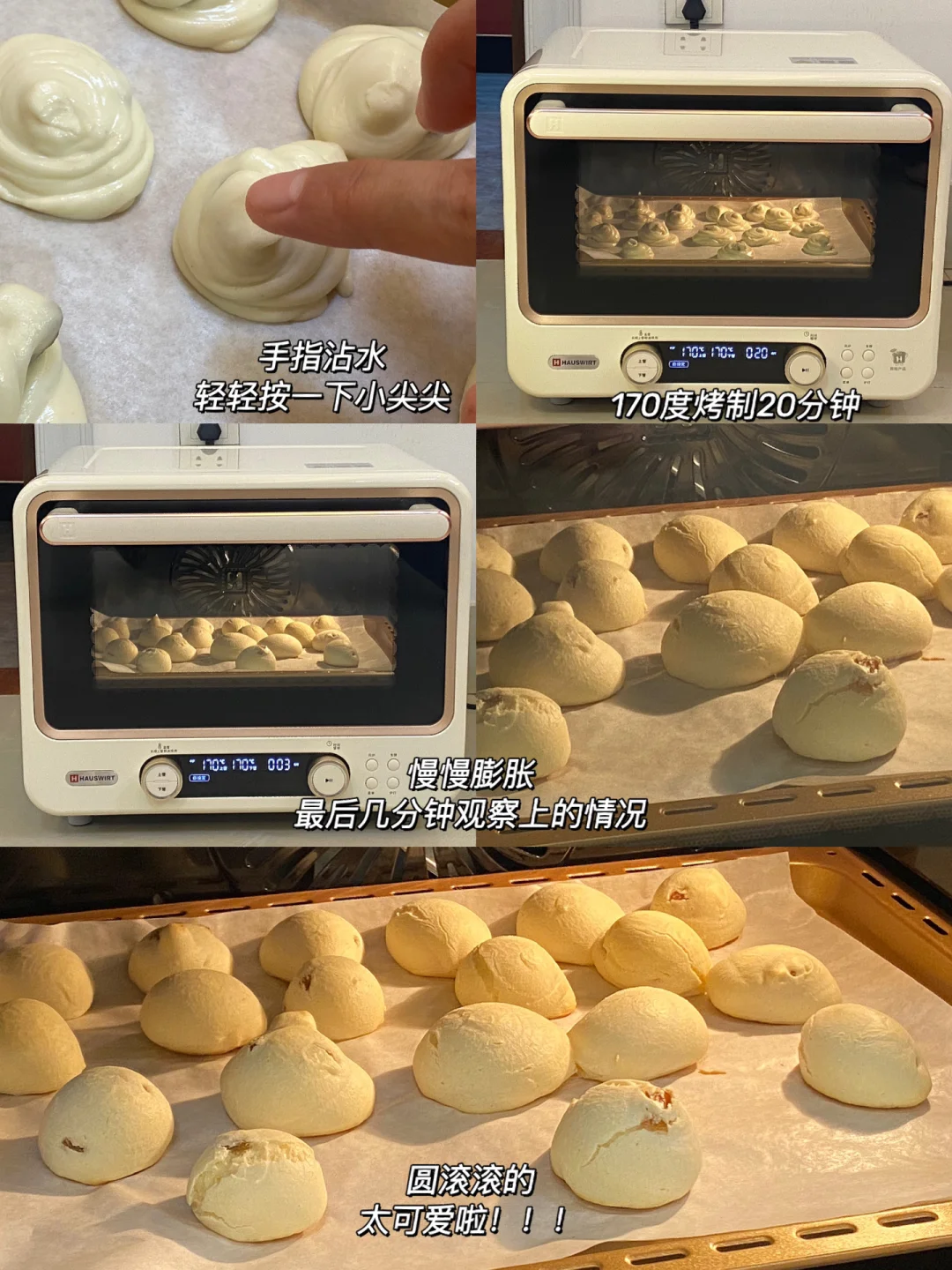 4.手指沾水,轻轻按一下小尖尖,挤入烤盘,170度烤制20分钟,最后几分钟观察上色情况,盯着紧一点。