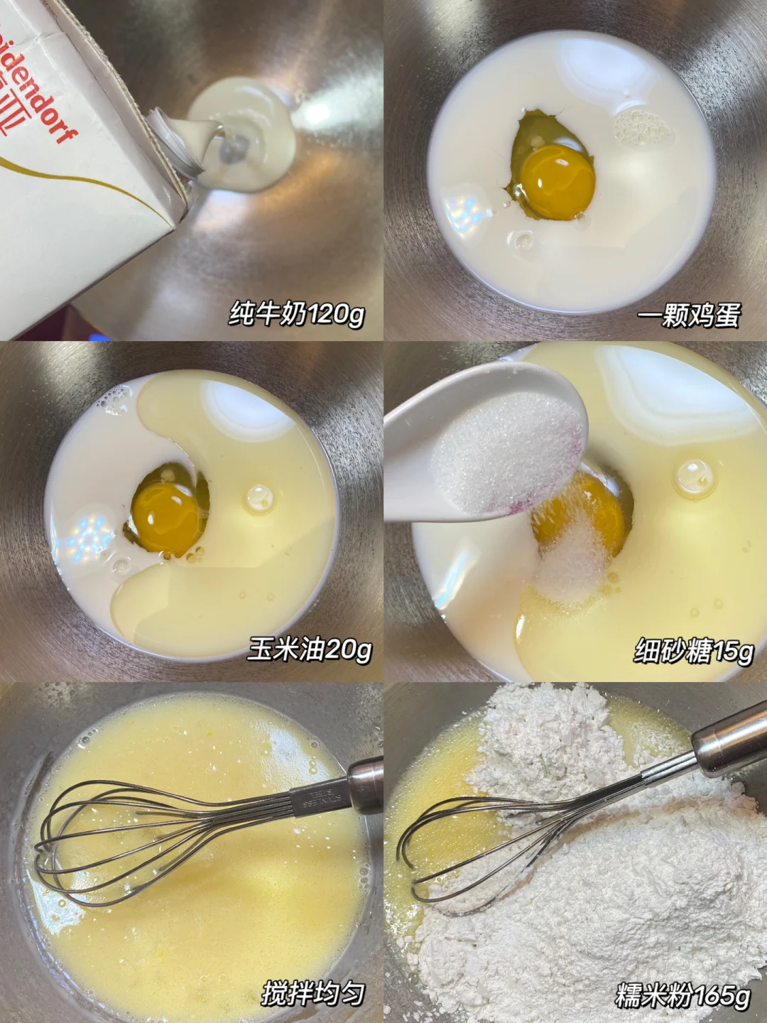 🍇做法:1.纯牛奶、鸡蛋、玉米油、细砂糖搅拌均匀。