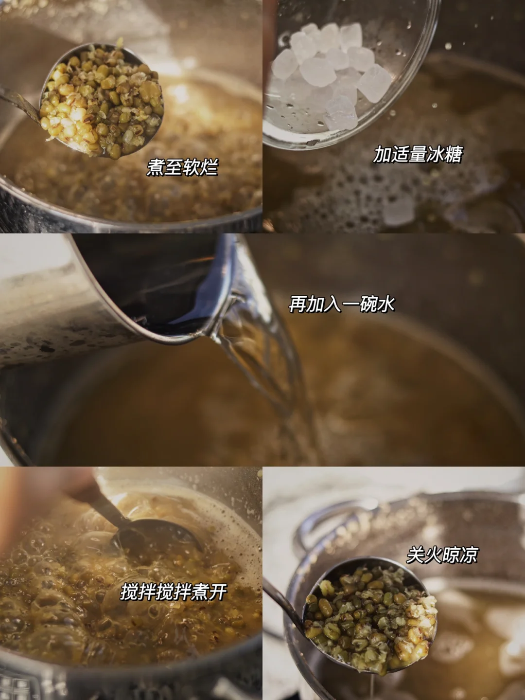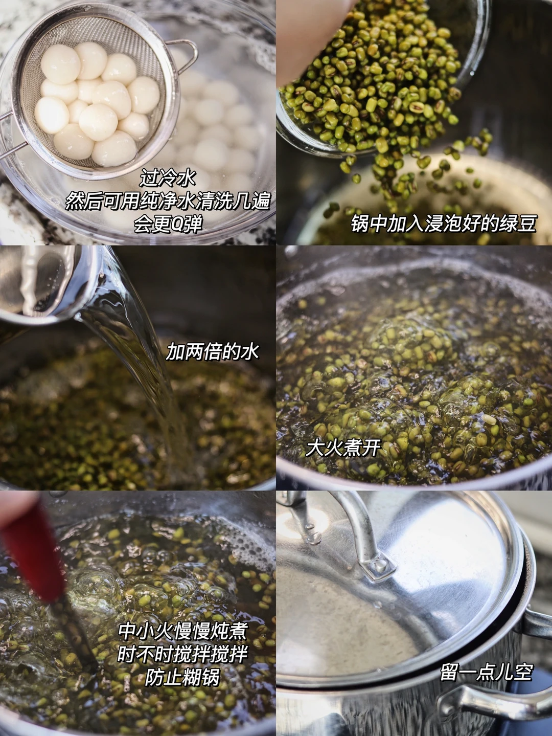 5.锅中加入浸泡好的绿豆,加两倍的水,大火煮开,中小火慢慢炖煮,时不时搅拌搅拌,防止糊锅,锅盖留一点儿空。